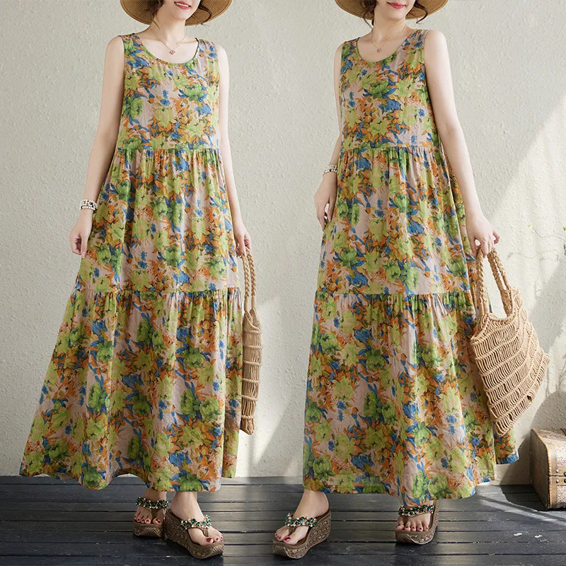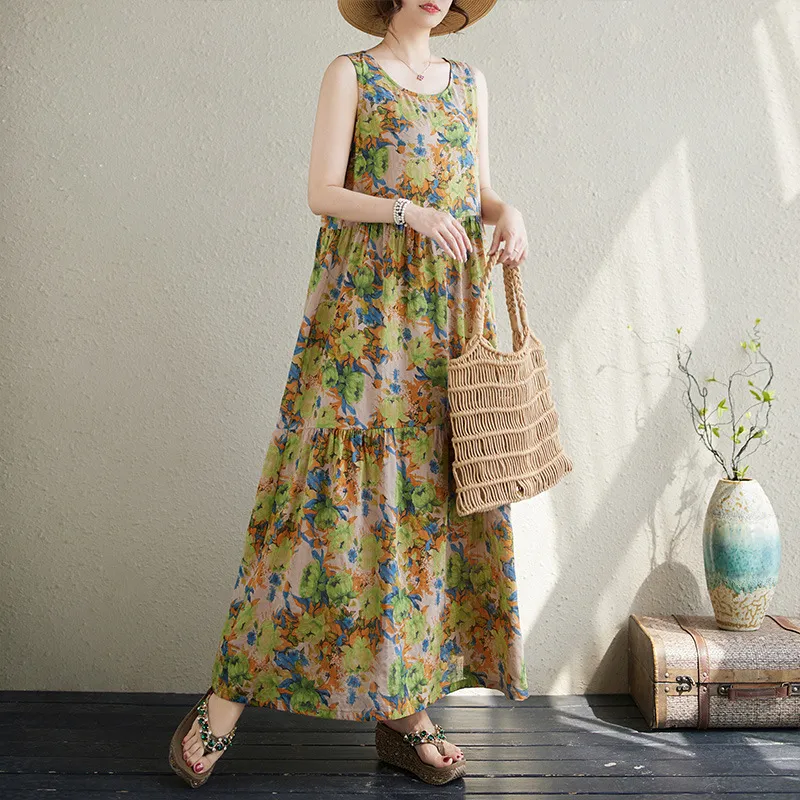 衣都精品- 新款大碼文藝印花顯瘦撞色無袖背心裙