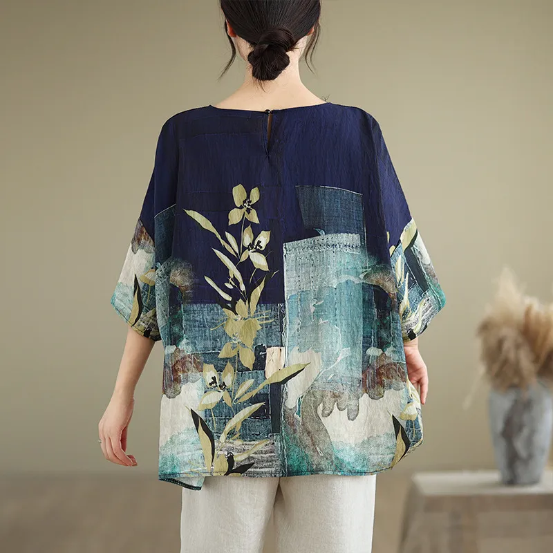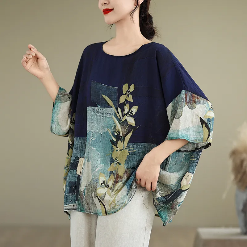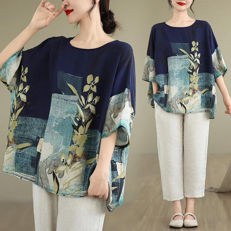 衣都精品- 新款民族風蝙蝠袖寬鬆大碼圓領上衣