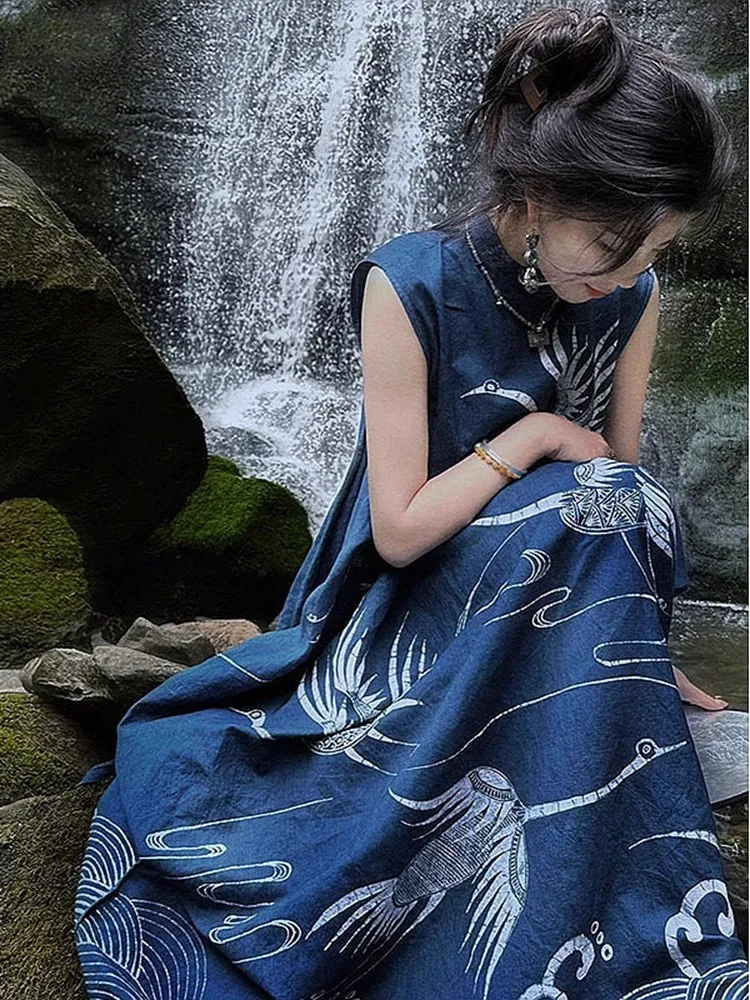 衣都精品- 新款圓領紮染藍薄綿綢花無袖背心裙