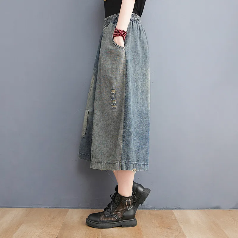 衣都精品- 新款復古做舊破洞寬鬆七分牛仔闊腿褲