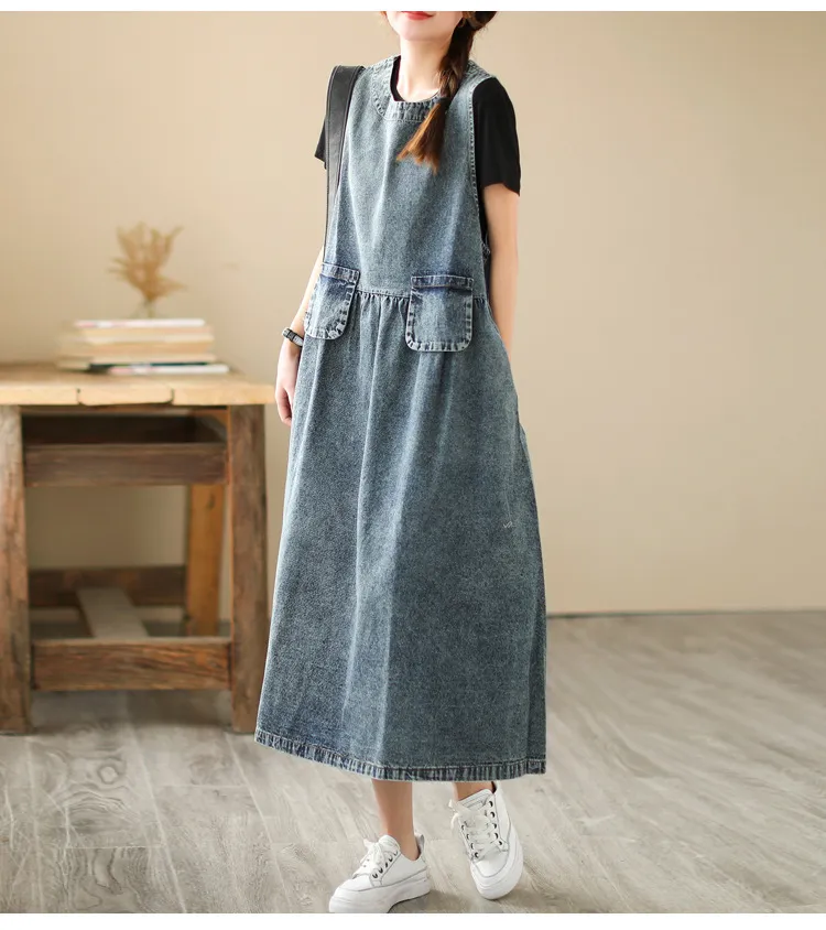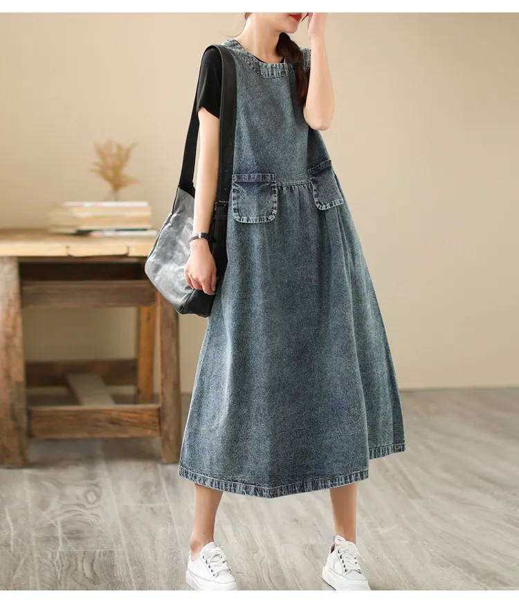 衣都精品- 新款甜美大碼寬鬆牛仔無袖連身裙