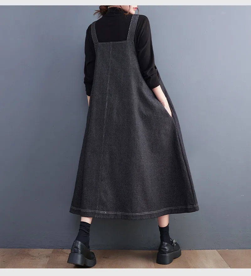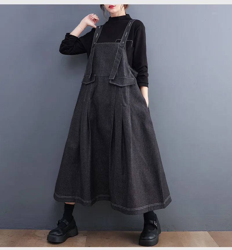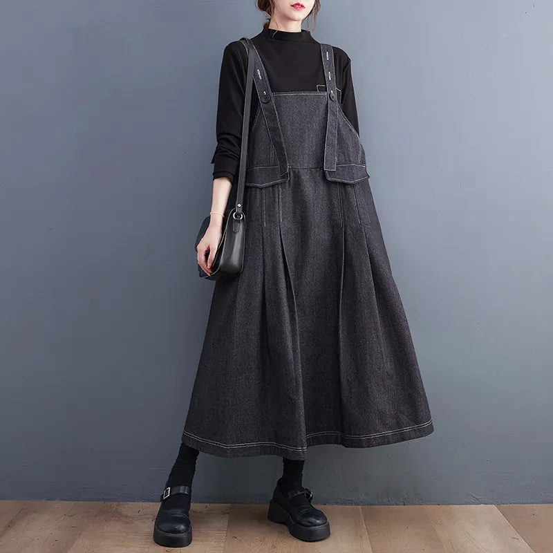 衣都精品- 新款復古設計感小眾壓褶休閒牛仔背帶裙
