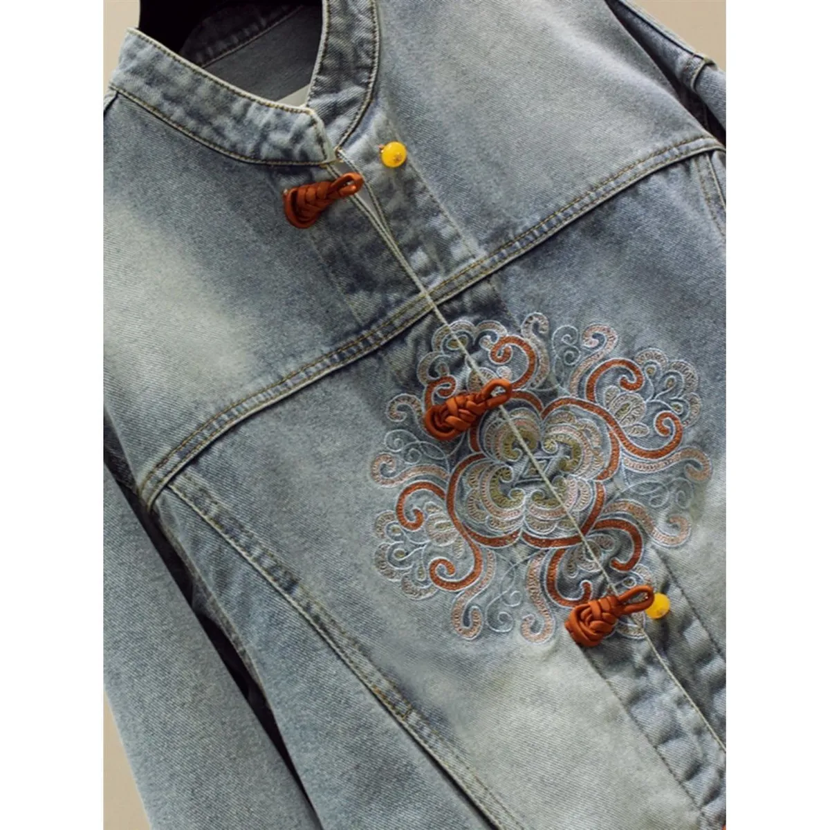 衣都精品- 新款復古中國風短版盤扣刺繡牛仔外套
