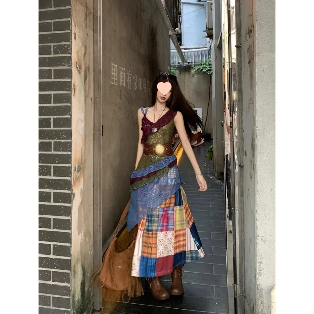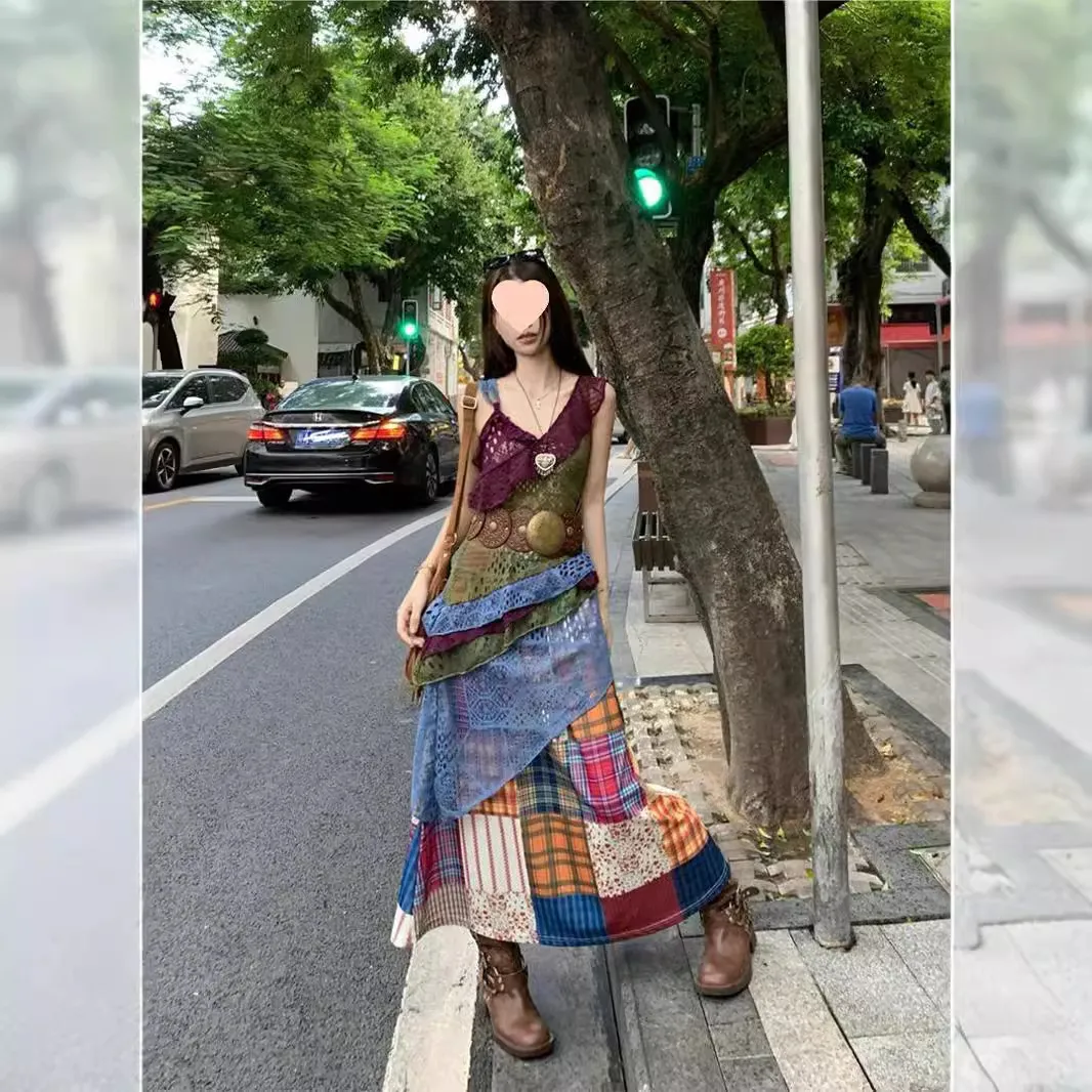 衣都精品- 新款時尚假兩件蕾絲拼接格子半身裙