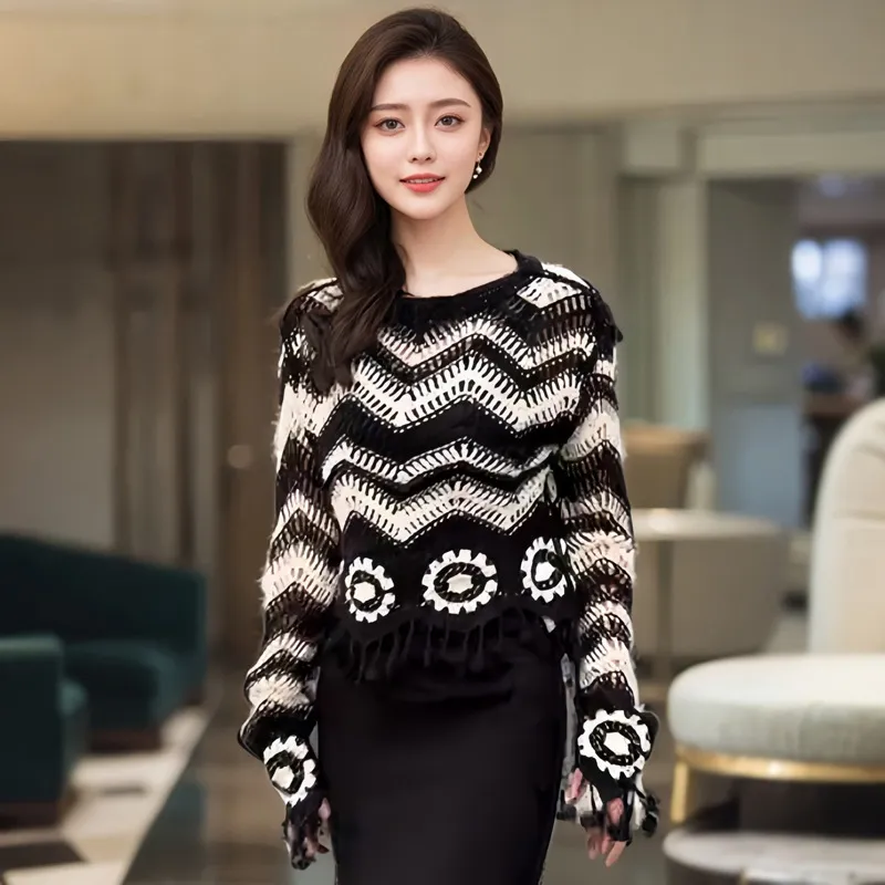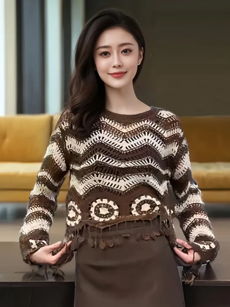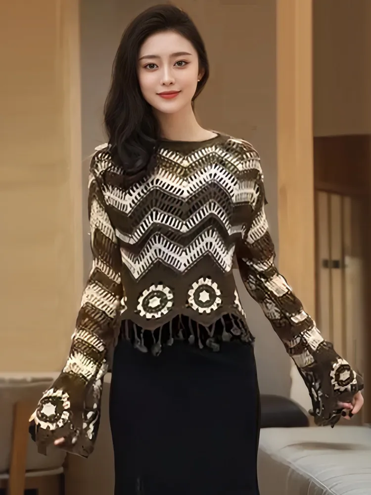 衣都精品- 新款大碼鉤花鏤空流蘇套頭針織衫上衣