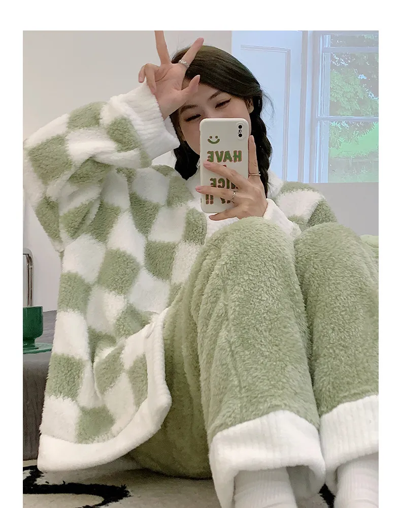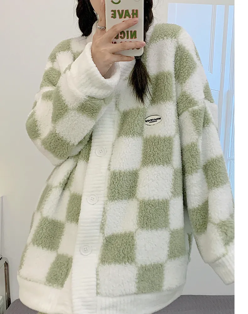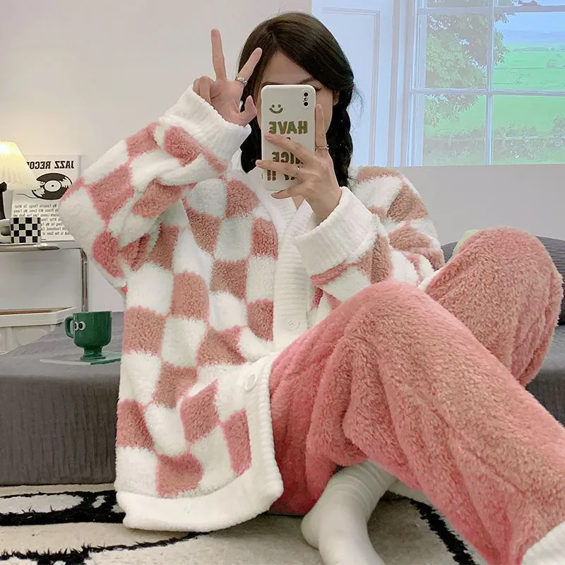 衣都精品- 新款棋盤格睡衣珊瑚絨可愛V領開衫套裝睡衣