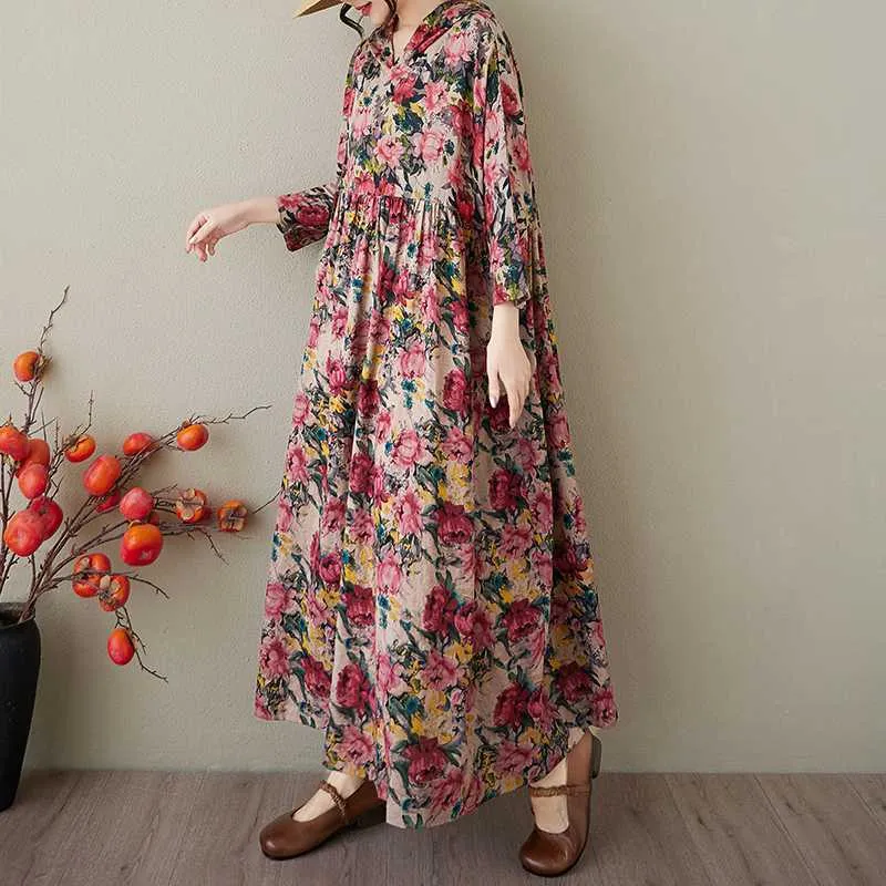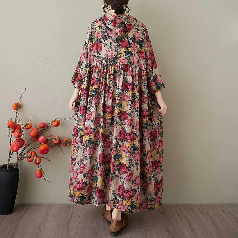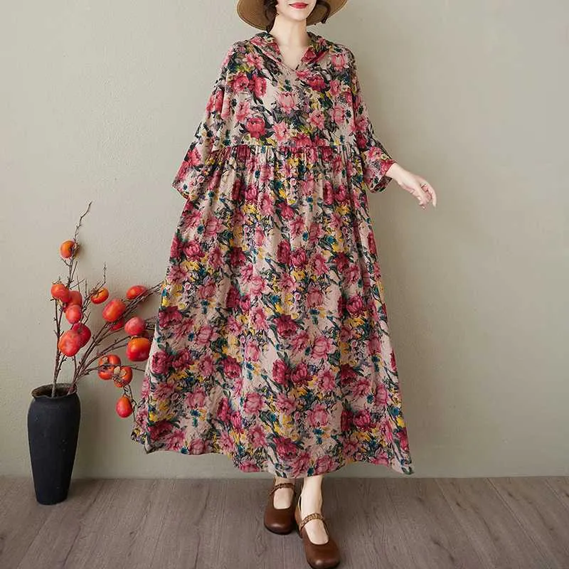 衣都精品- 新款復古大碼寬鬆連帽印花連衣裙