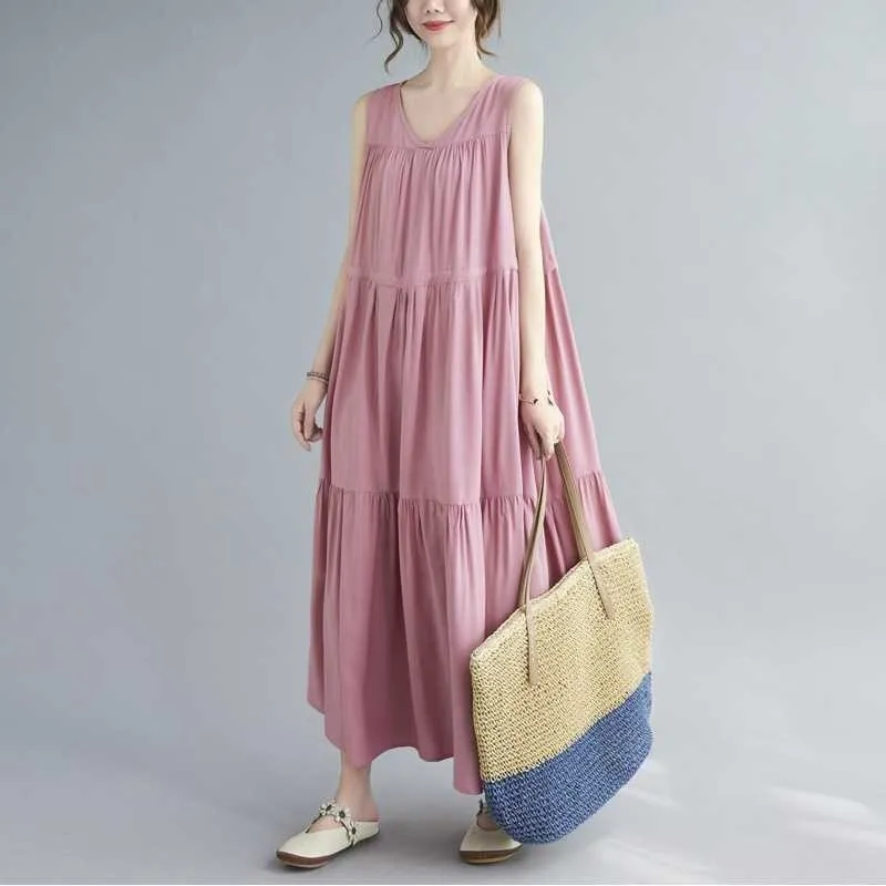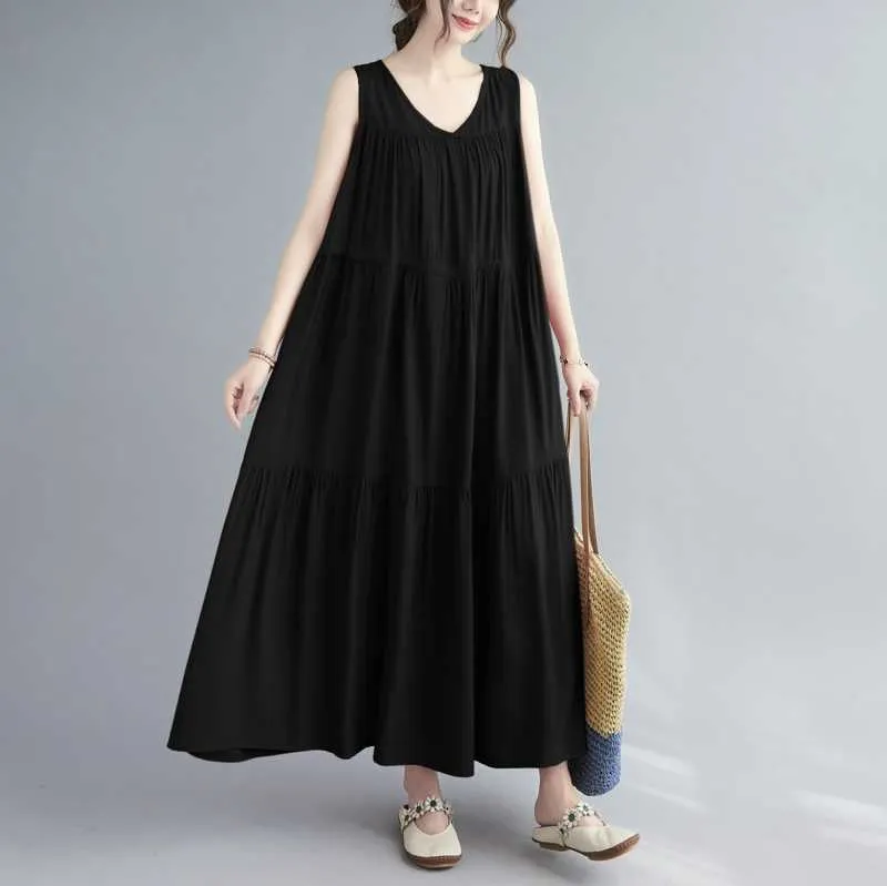 衣都精品- 新款韓版大碼抽繩寬鬆長款無袖連衣裙