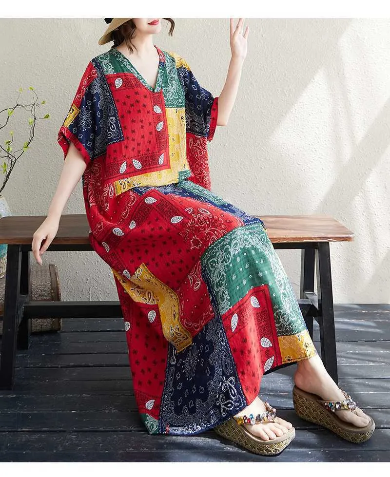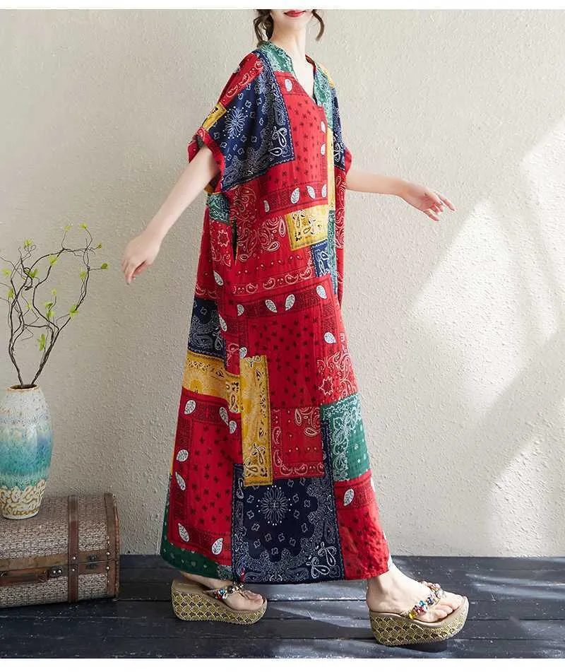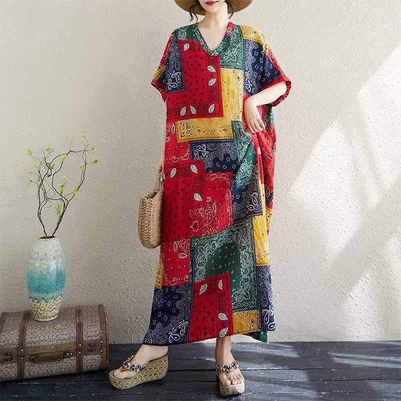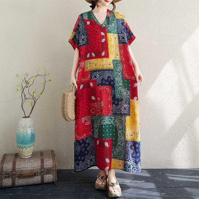 衣都精品- 新款V領薄棉麻大碼寬鬆復古連衣裙
