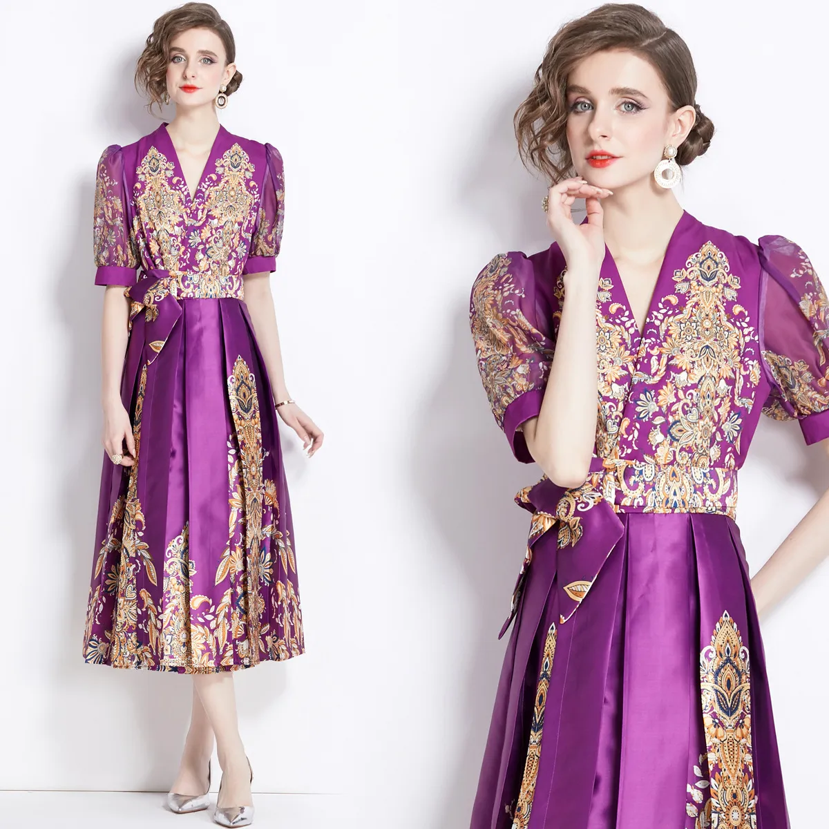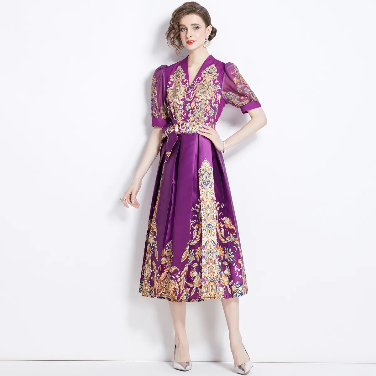 衣都精品- 新款復古宮廷風印花V領泡泡袖連衣裙
