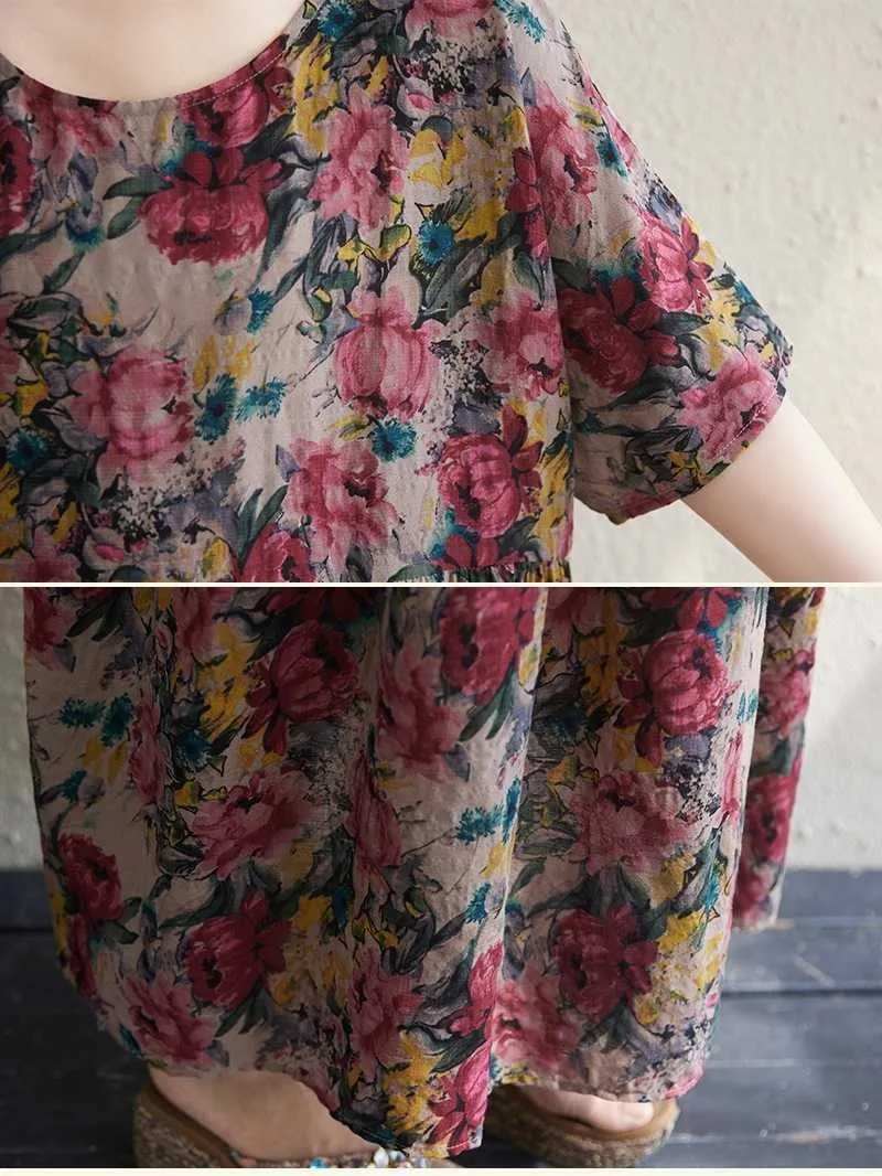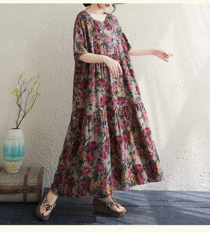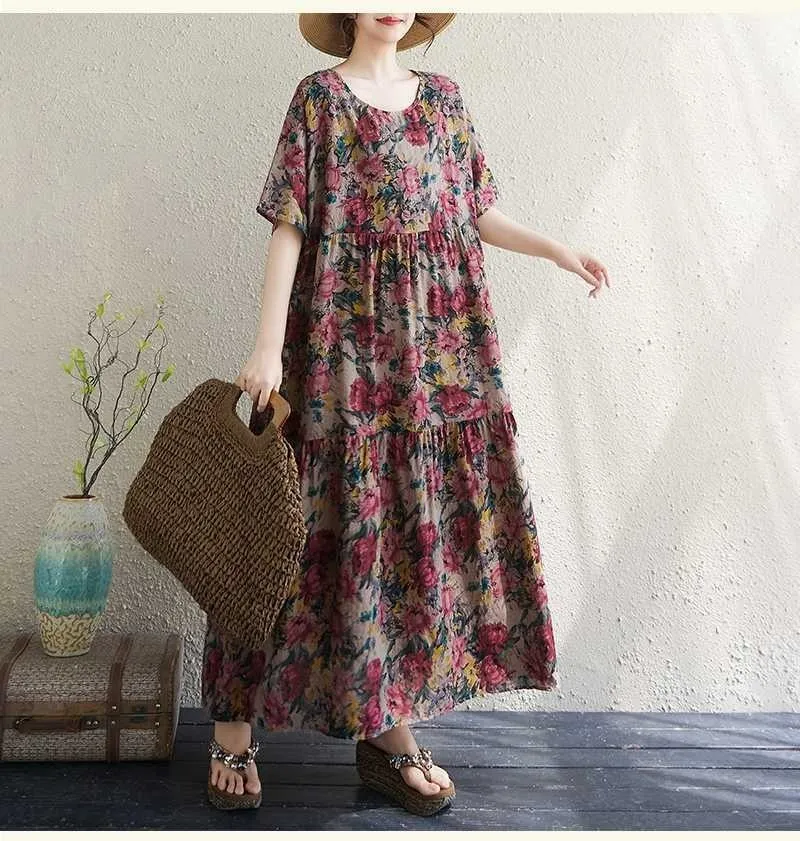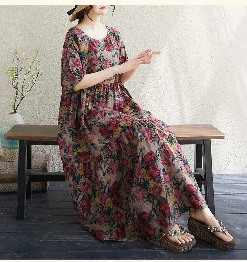 衣都精品- 新款復古V領薄棉麻大碼寬鬆連衣裙