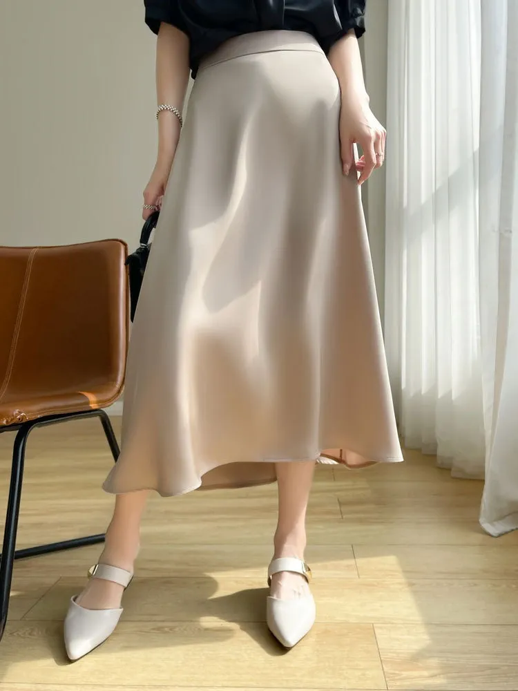 衣都精品- 新款高腰顯瘦氣質緞面絲滑半身裙
