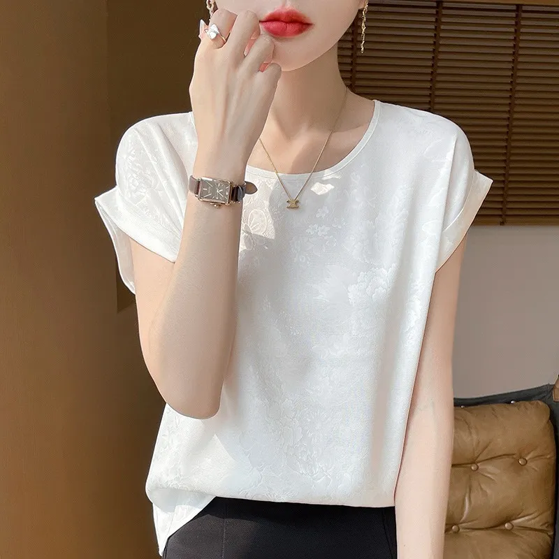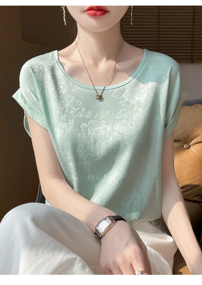 衣都精品- 新款圓領短款氣質暗花大碼短袖上衣