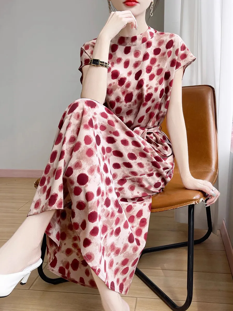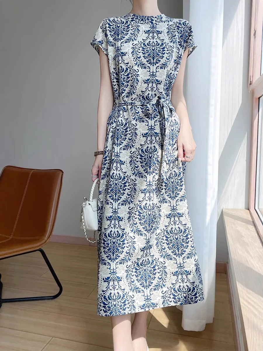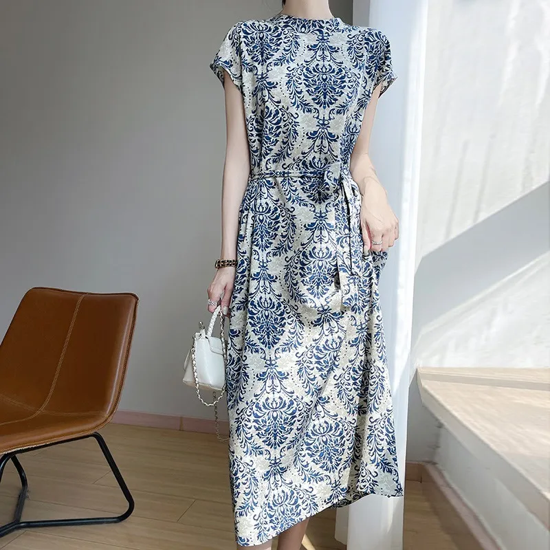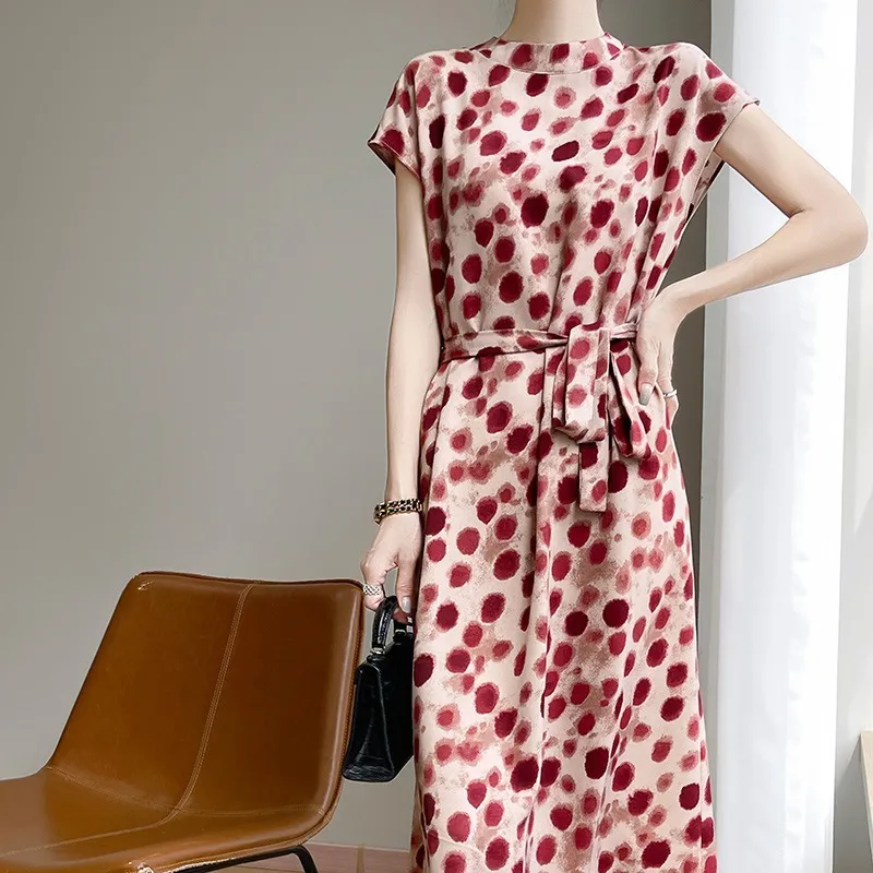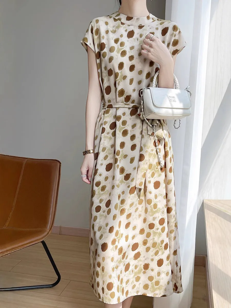 衣都精品- 新款繫帶印花緞面半高領短袖連衣裙
