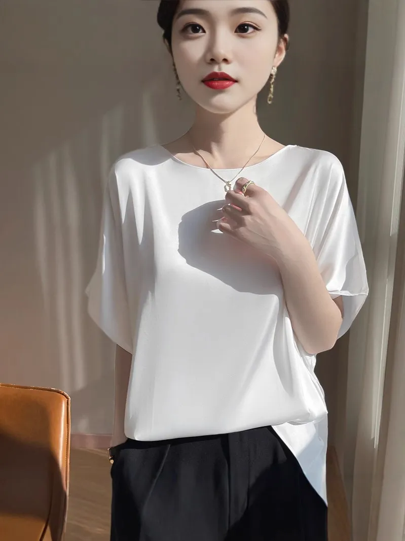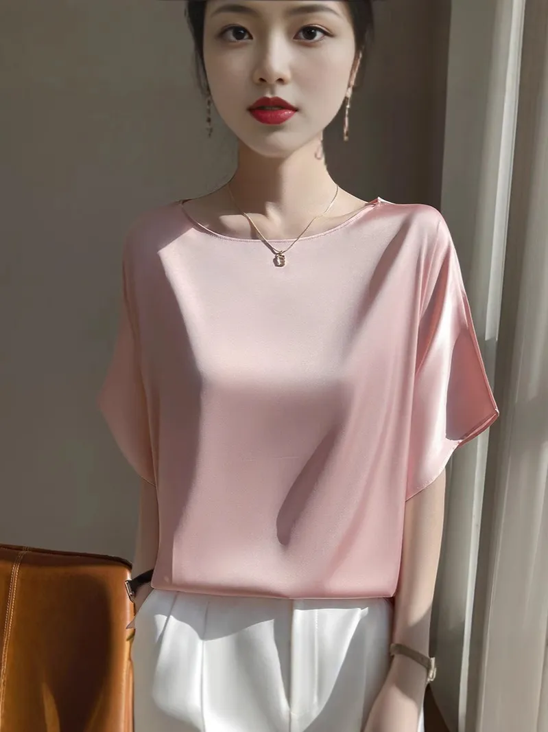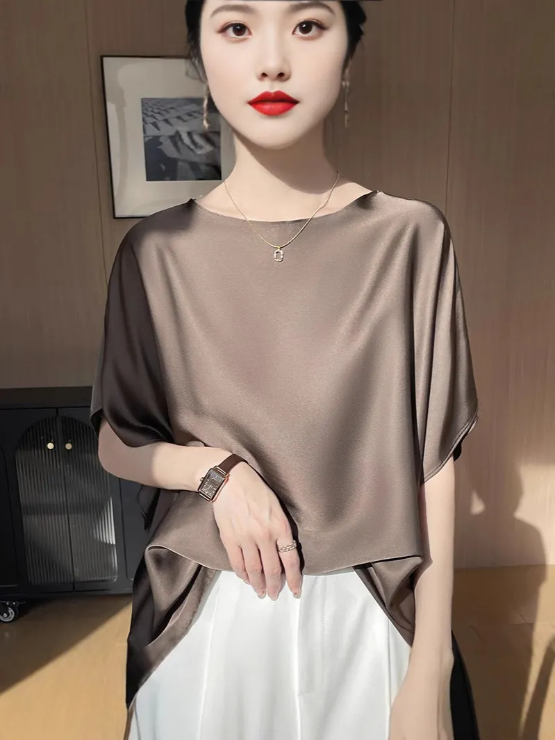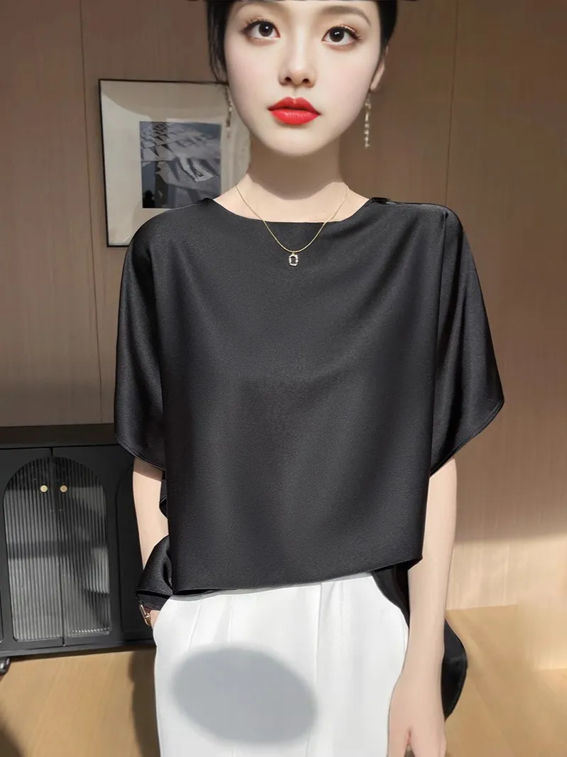 衣都精品- 新款圓領寬鬆蝙蝠袖絲質緞面上衣