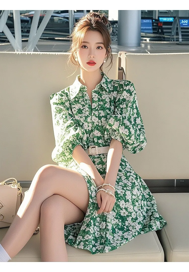 衣都精品- 新款韓系減齡洋氣綠色碎花連衣裙