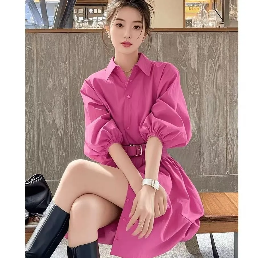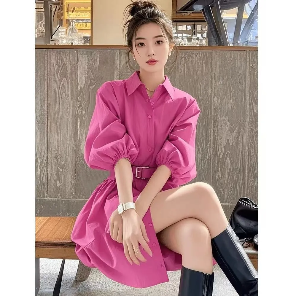 衣都精品- 新款輕奢高級感小眾玫紅色翻領連衣裙