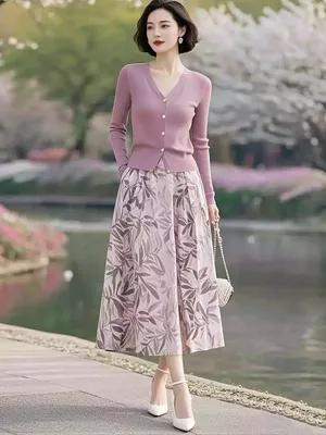 衣都精品- 新款時尚漂亮粉紫色針織開襟衫+碎花半身裙兩件式套裝