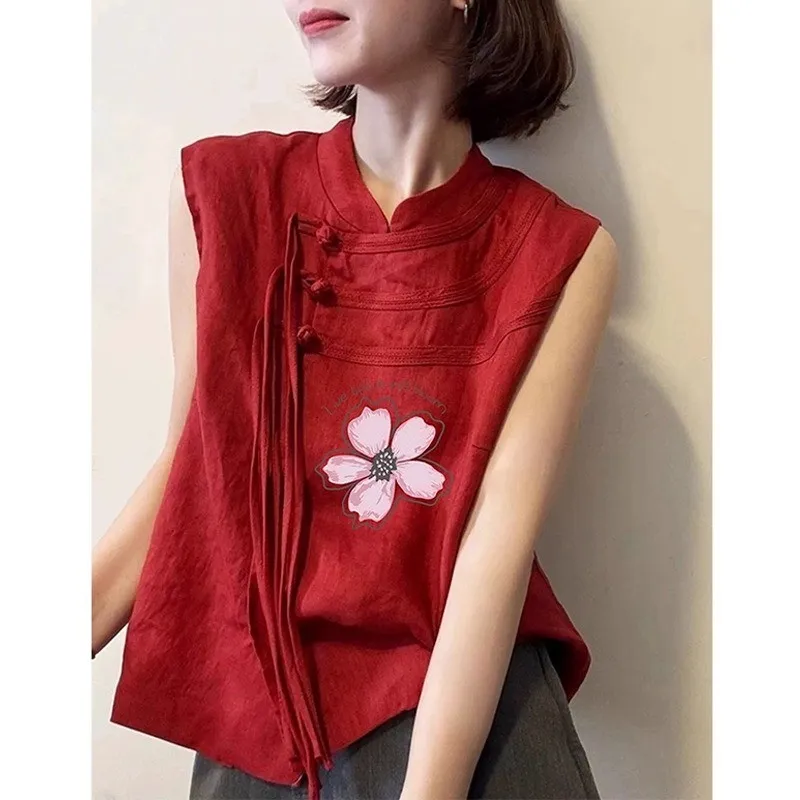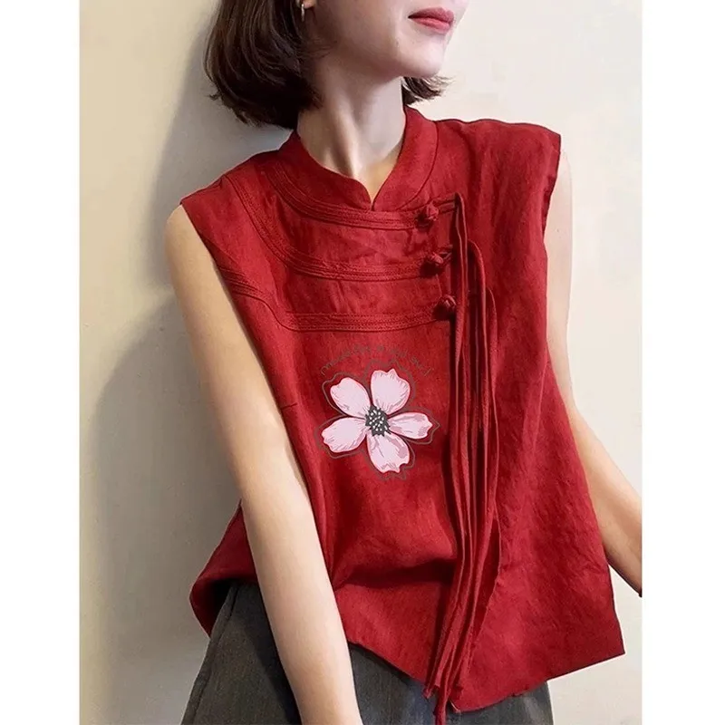 衣都精品- 新款設計感圓領盤扣無袖印花馬甲上衣