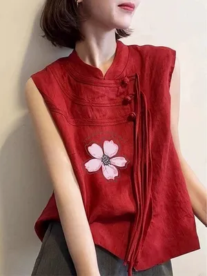 衣都精品- 新款設計感圓領盤扣無袖印花馬甲上衣