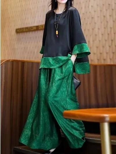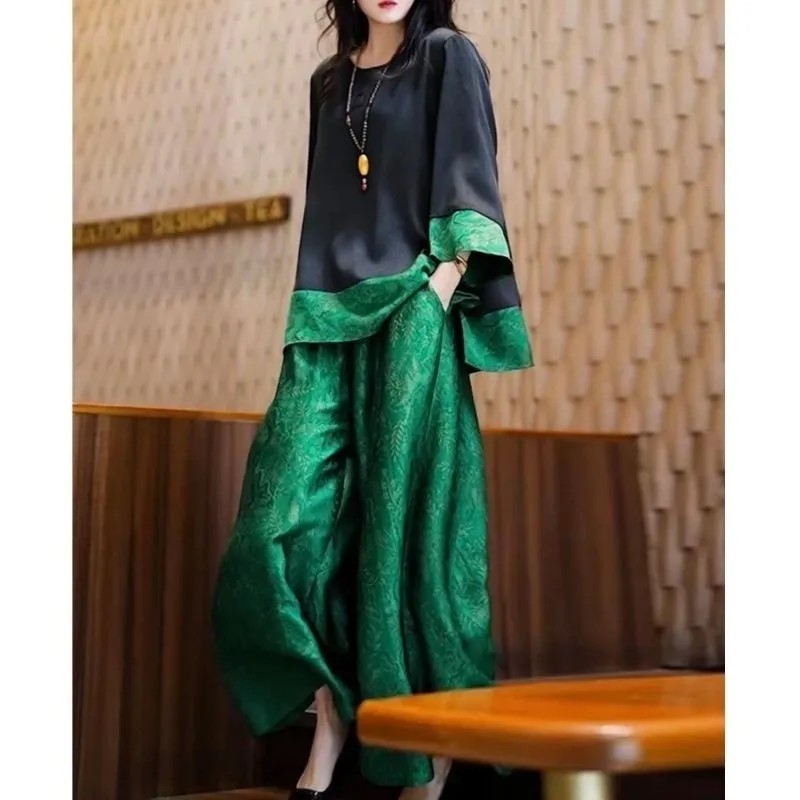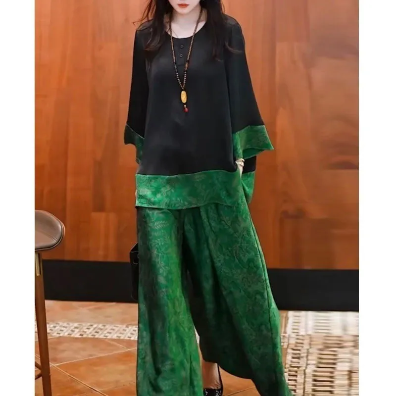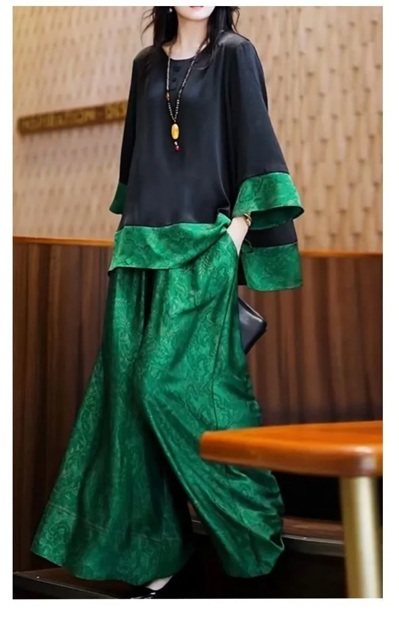 衣都精品- 新款高檔寬版緞面上衣+褲子兩件式套裝