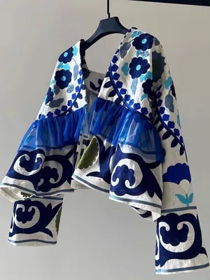 衣都精品- 新款時尚小眾度假風藍色繡花開衫外套