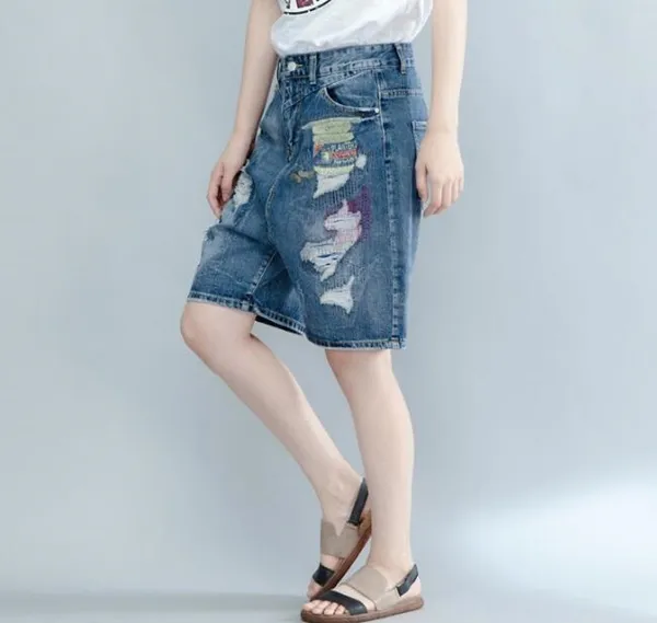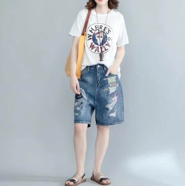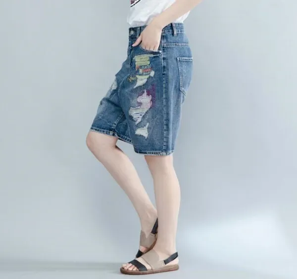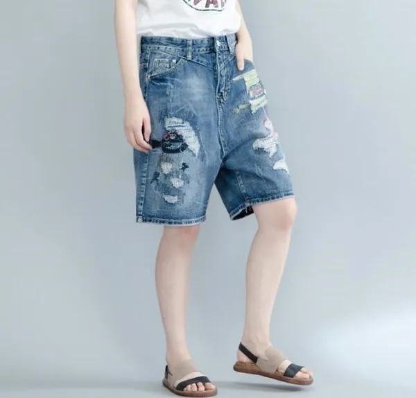 衣都精品-時尚寬鬆大碼繡花破洞牛仔褲