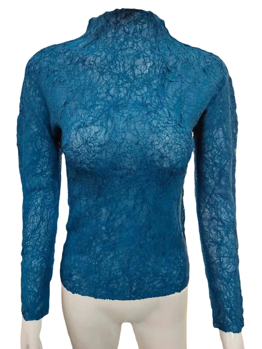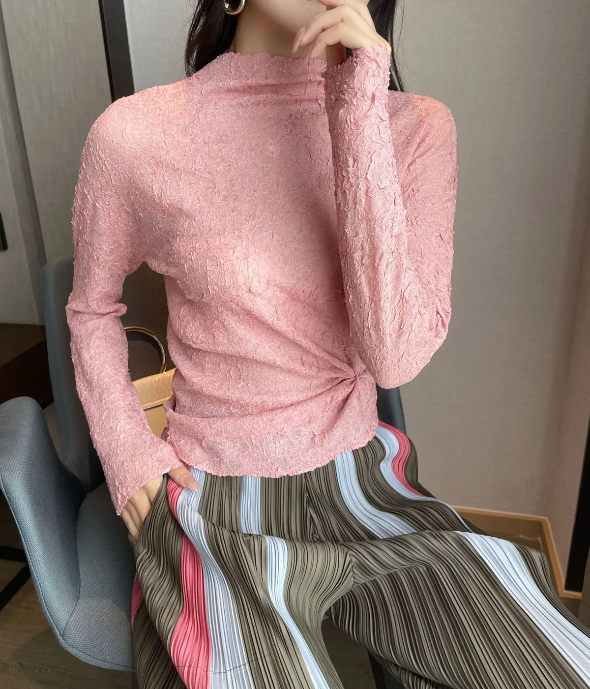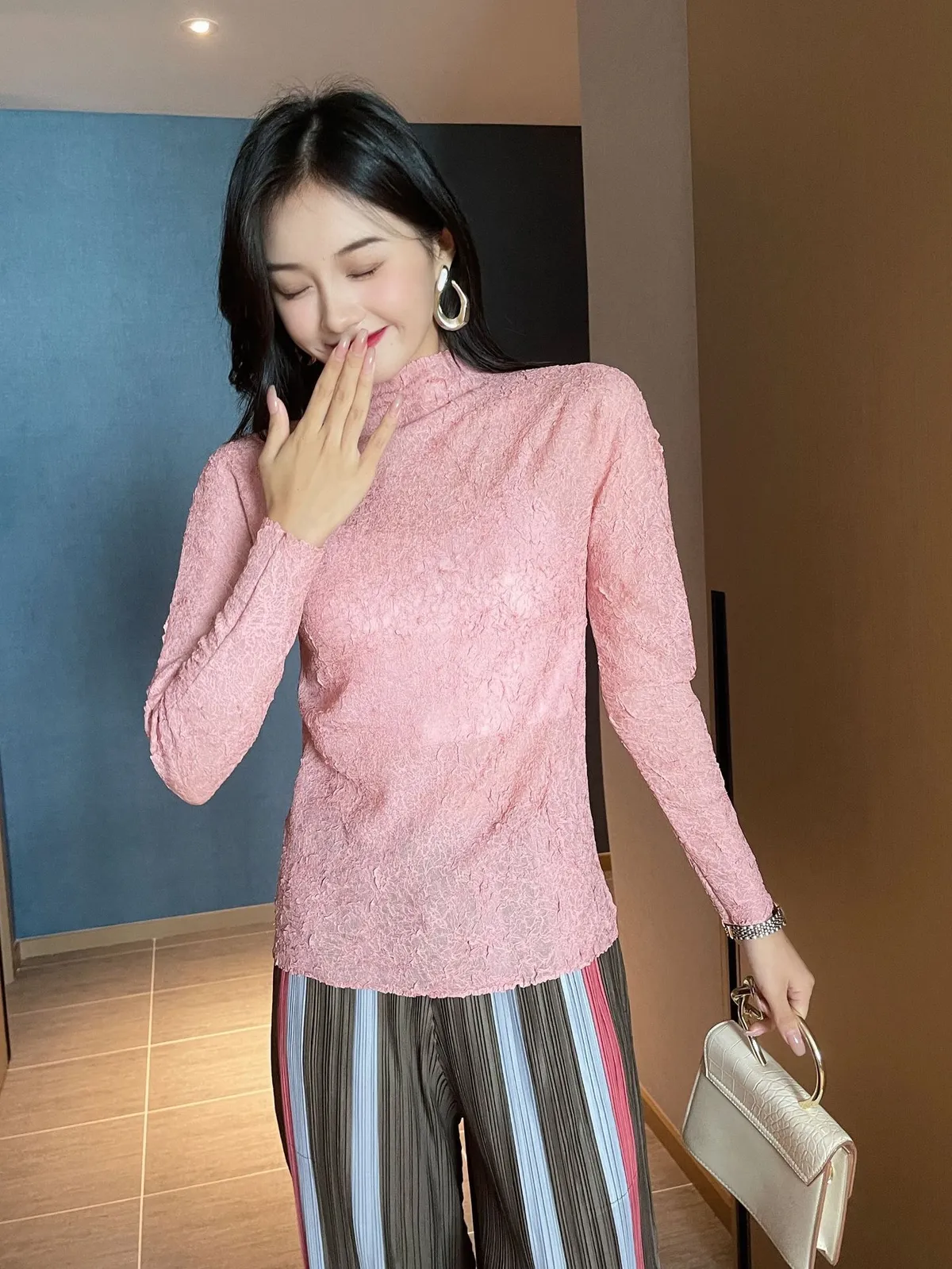 衣都精品- 2021秋季新款氣質高領印花緊身褶皺上衣