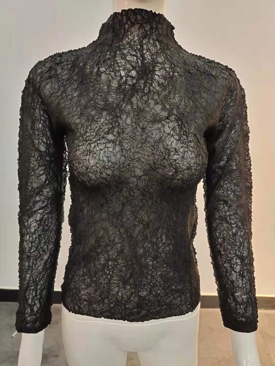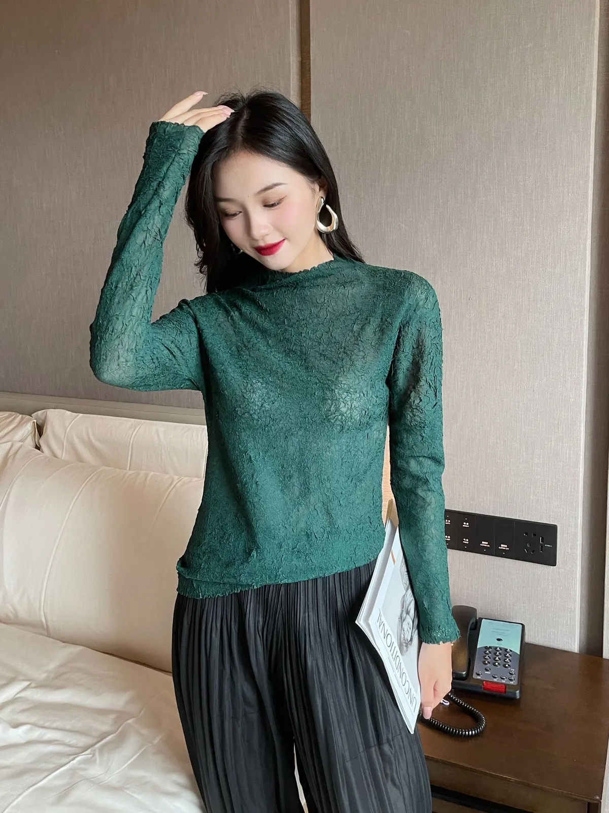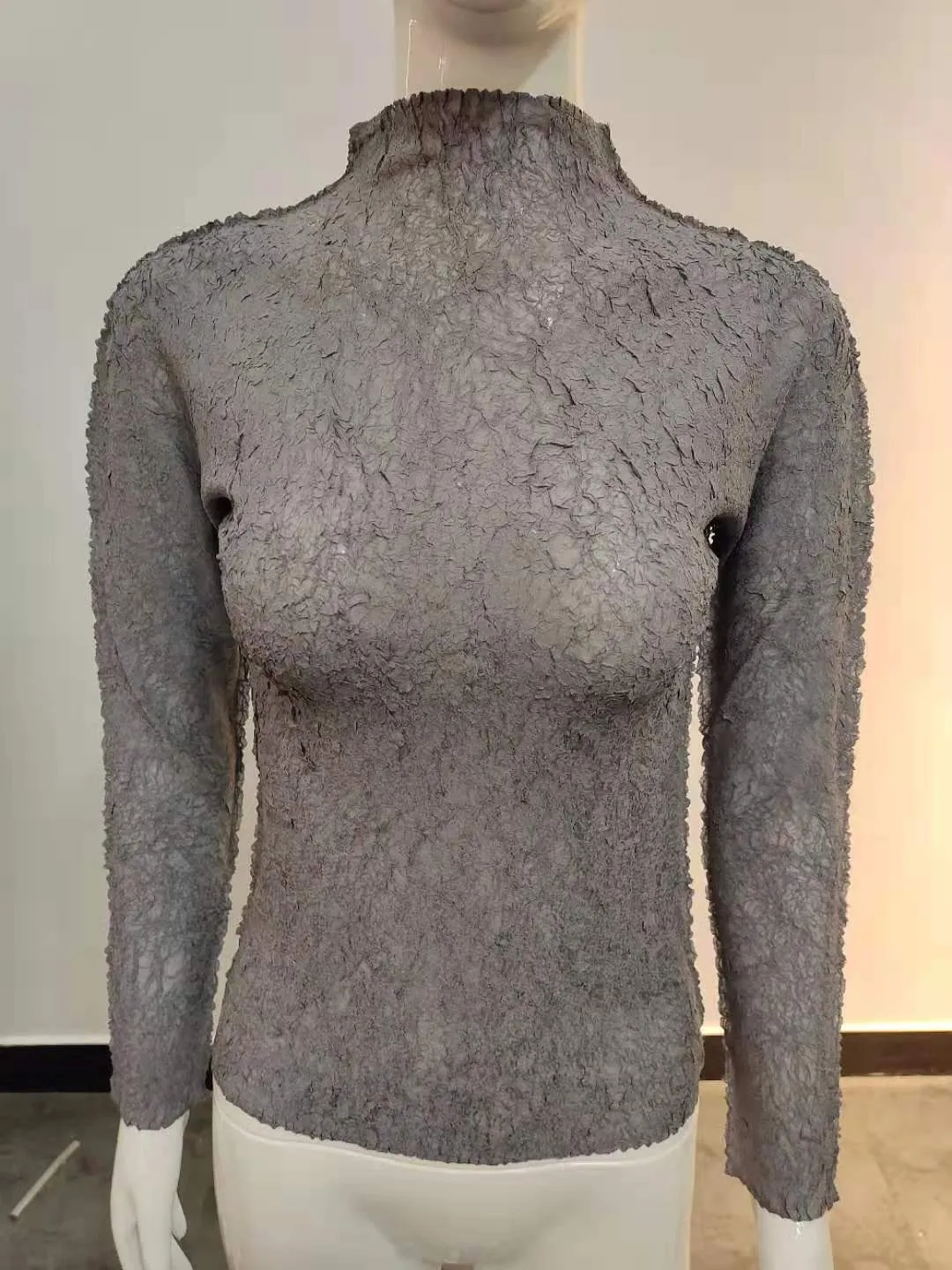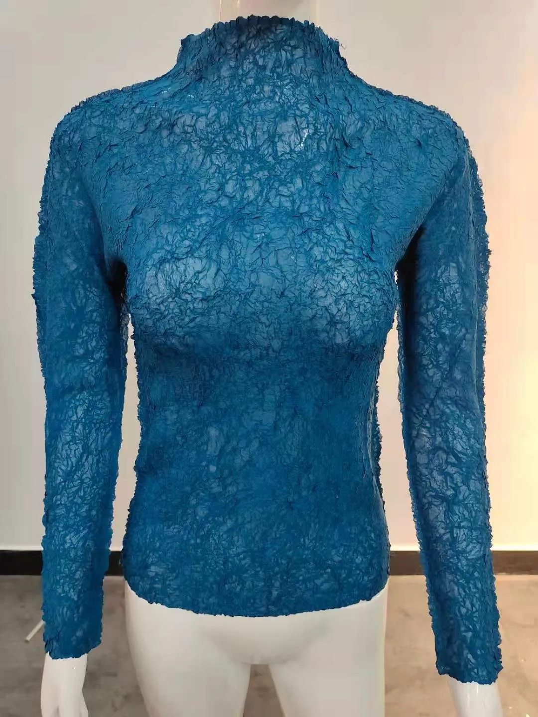 衣都精品- 2021秋季新款氣質高領印花緊身褶皺上衣