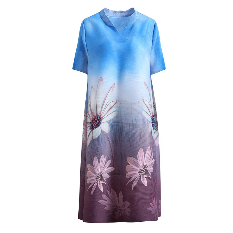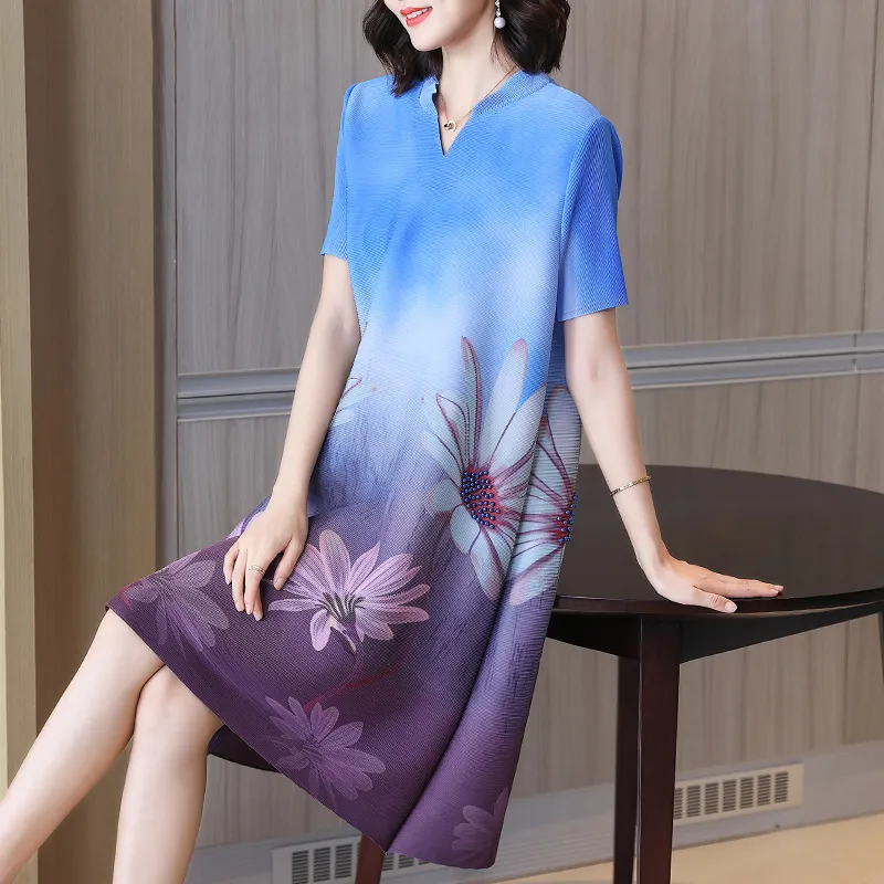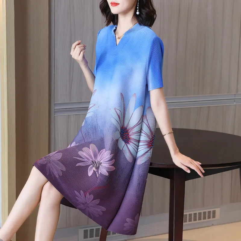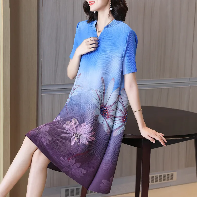 衣都精品- 2022春夏新款復古印花洋氣短袖褶皺連衣裙
