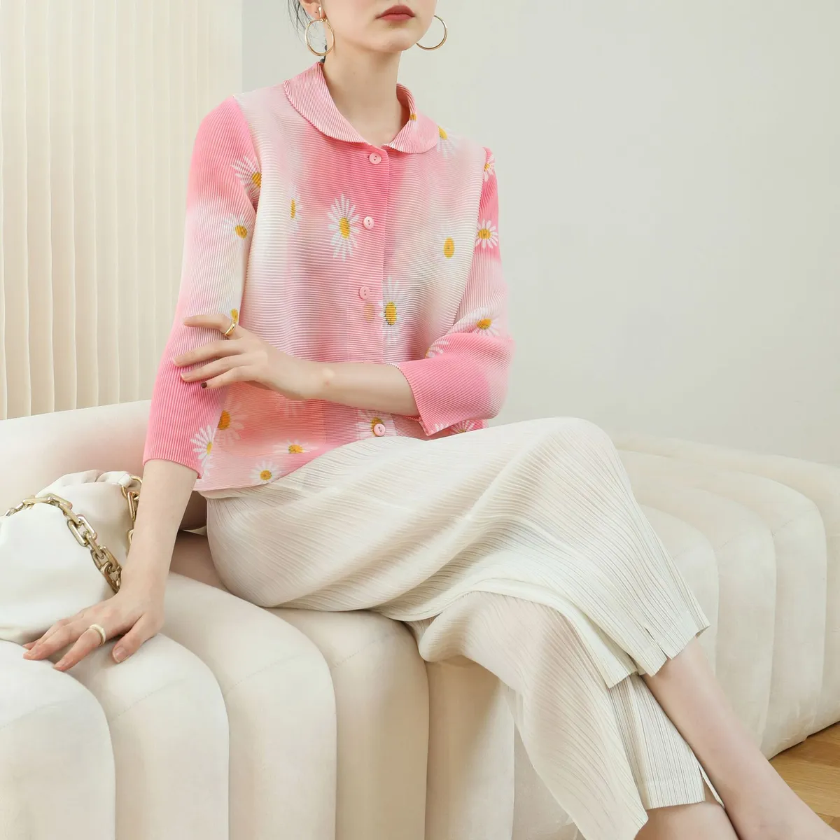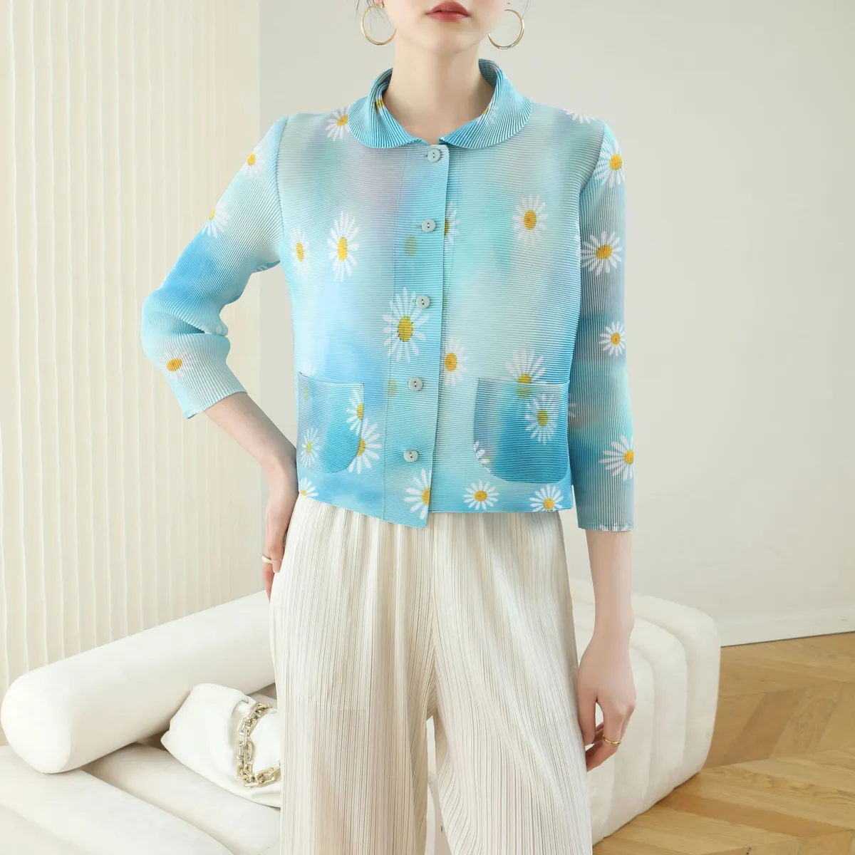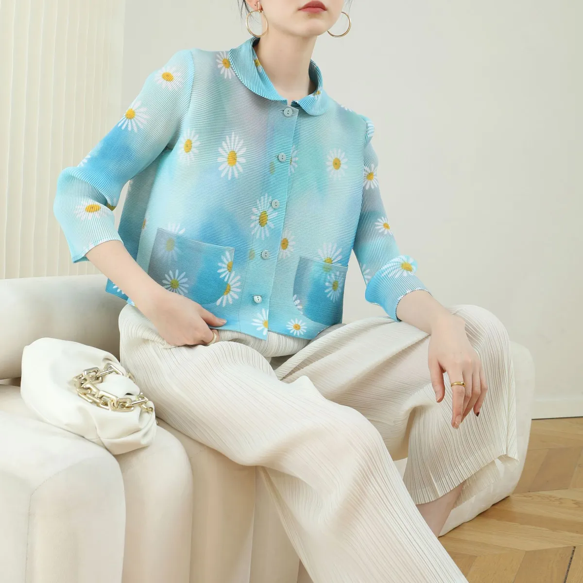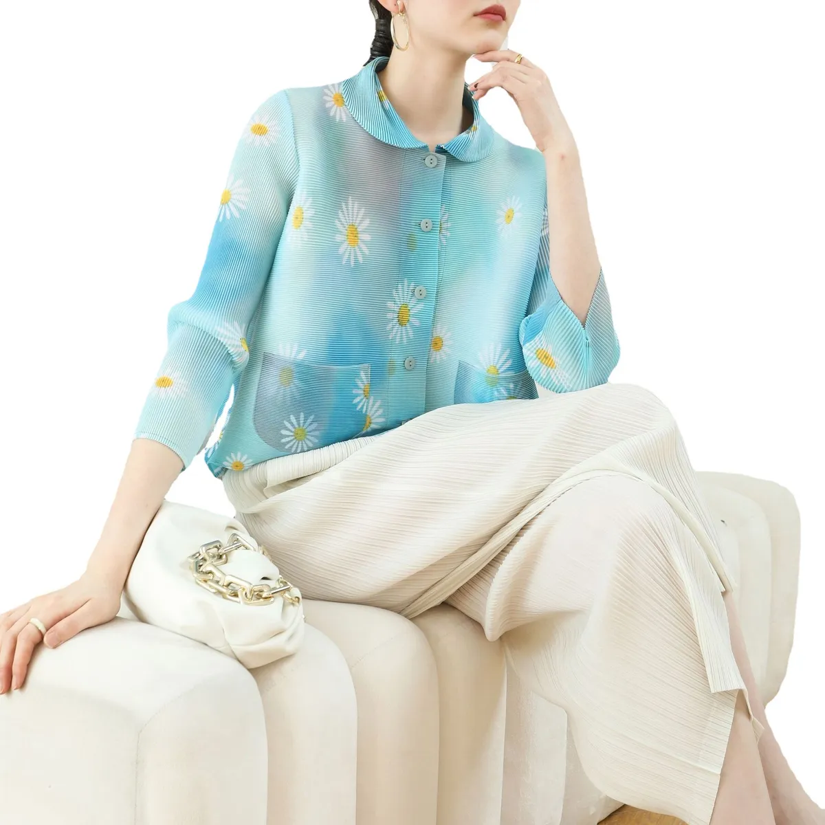 衣都精品- 2022秋季新款清新甜美長袖翻領印花褶皺上衣