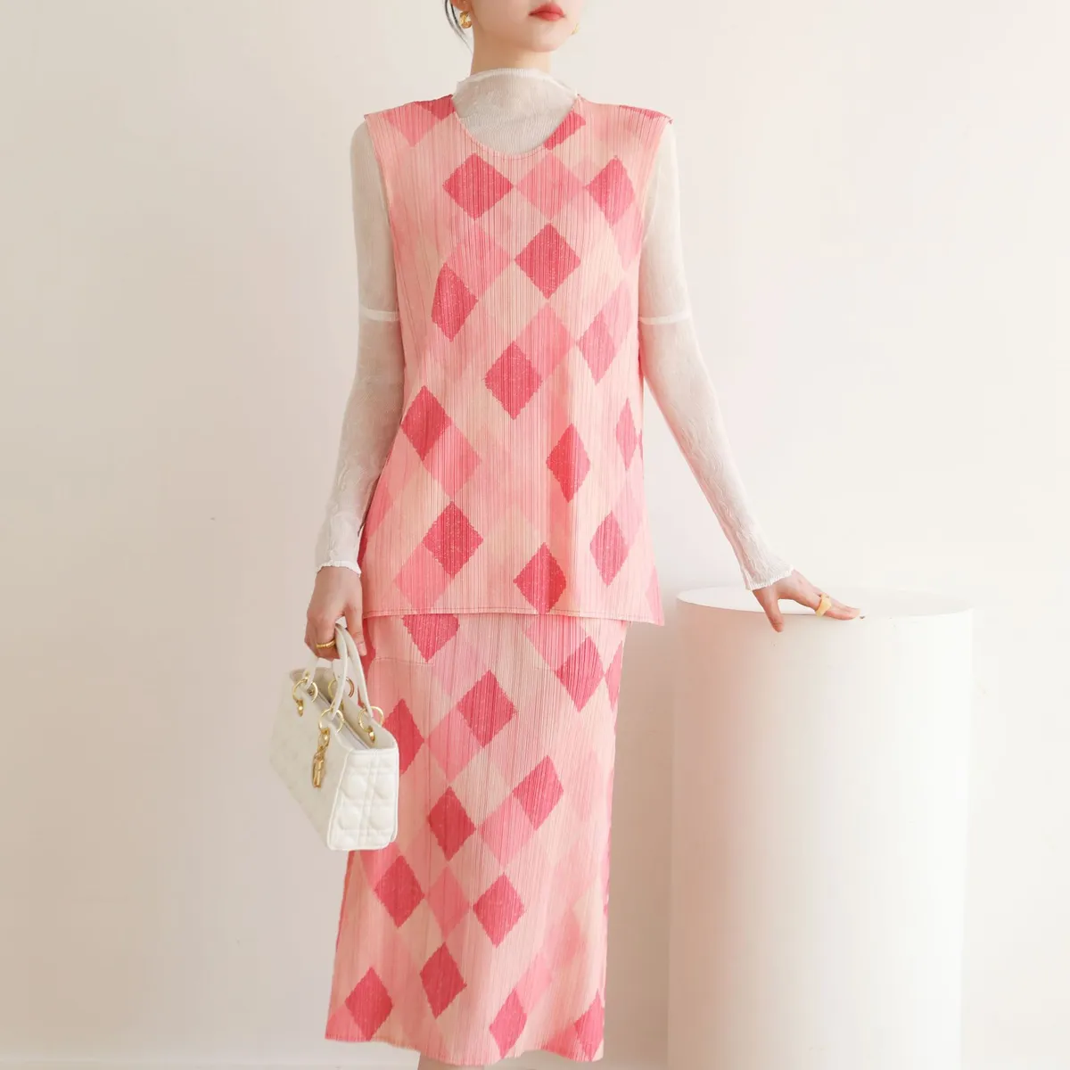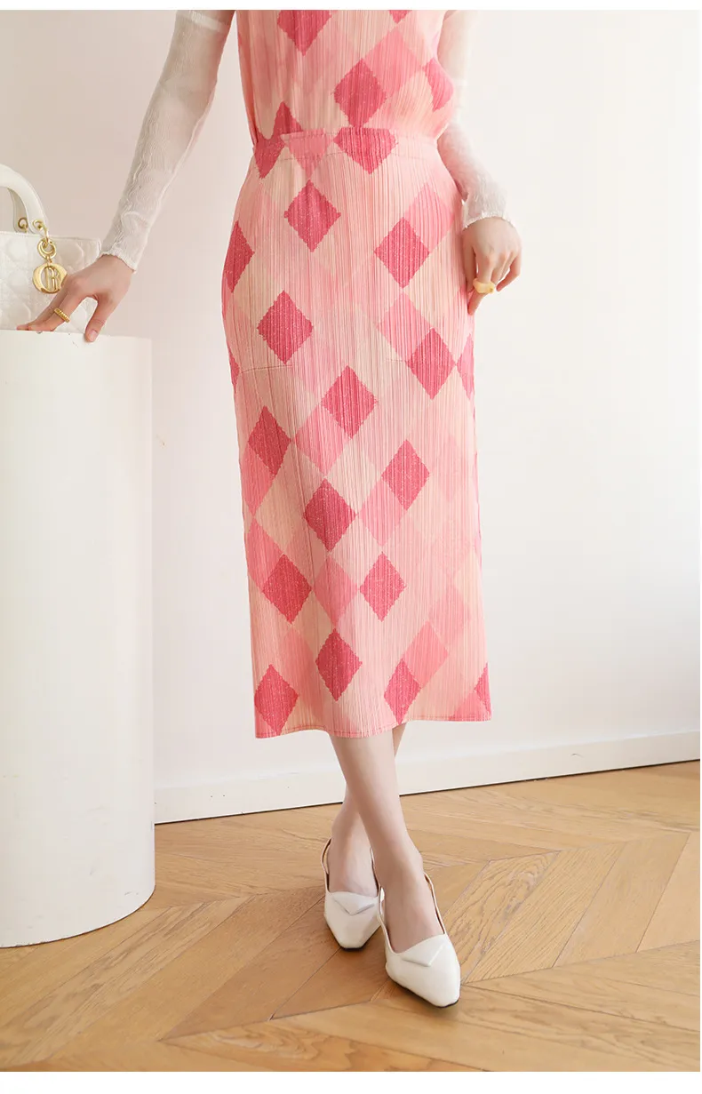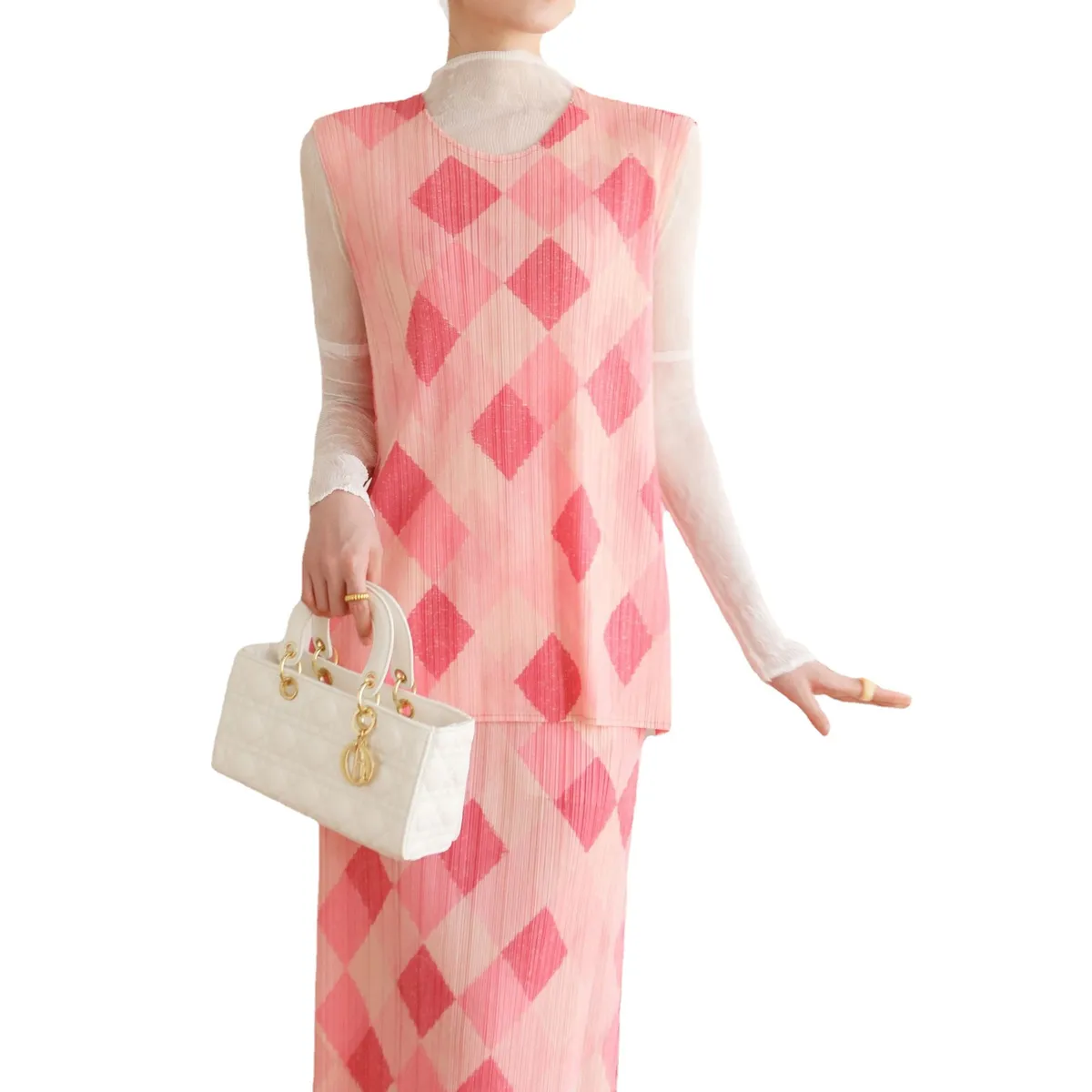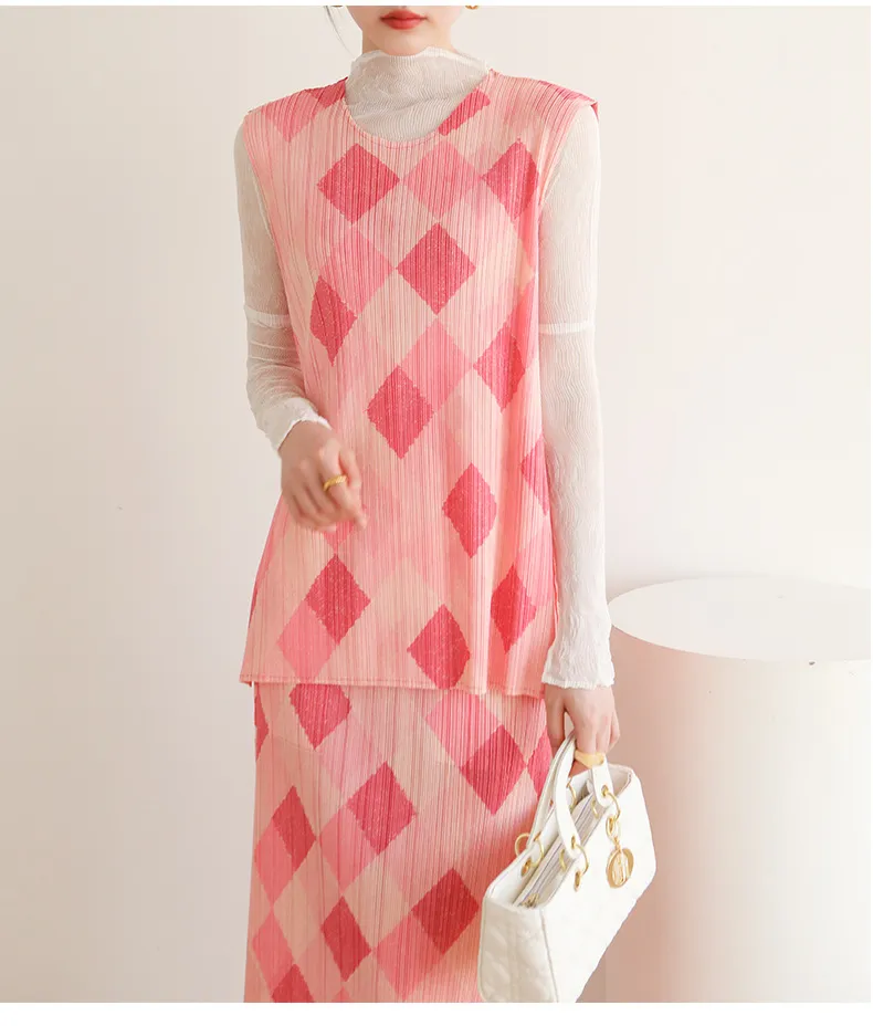 衣都精品- 2023新款菱形格印花端莊褶皺上衣