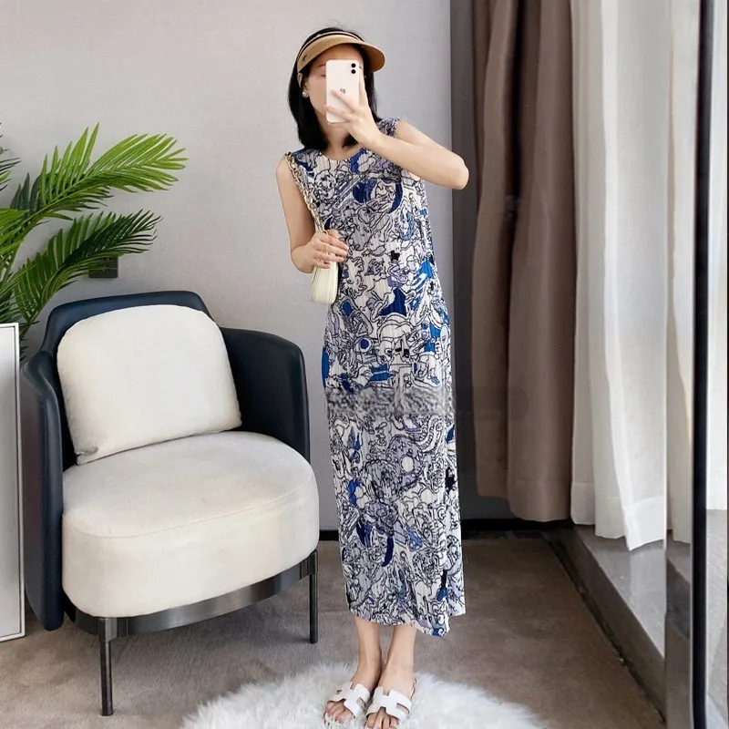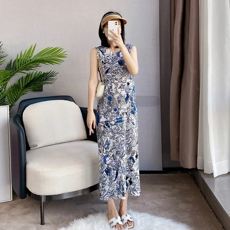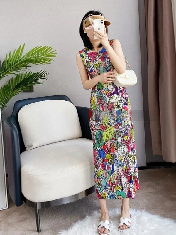 衣都精品- 2023新款復古褶皺印花無袖修身背心裙