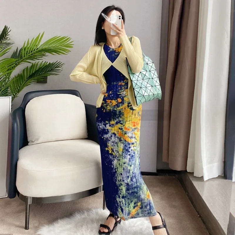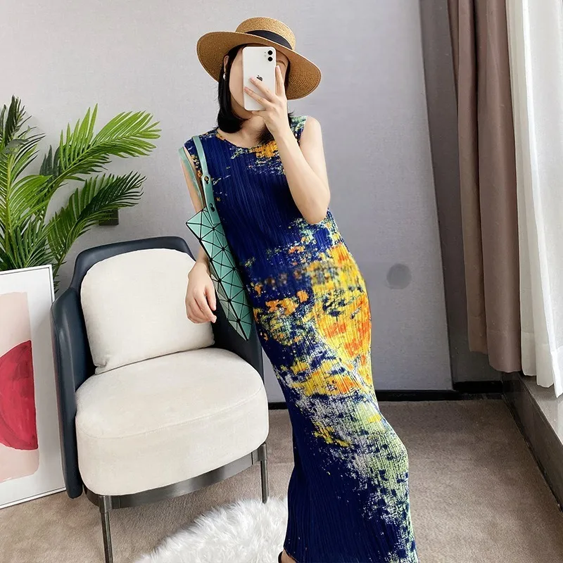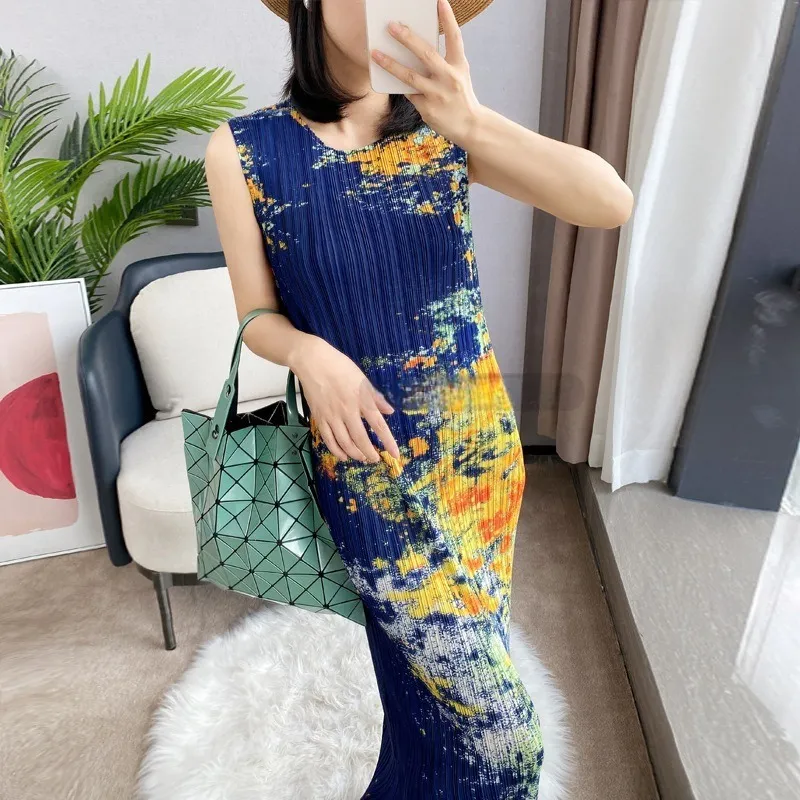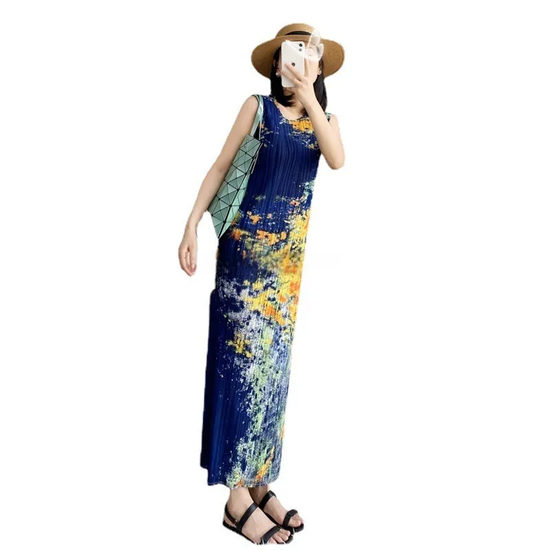衣都精品- 2023新款復古褶皺印花無袖修身背心裙