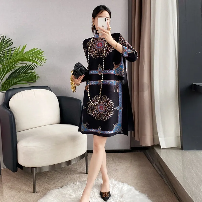 衣都精品- 2023新款寬鬆大碼洋氣印花褶皺連衣裙