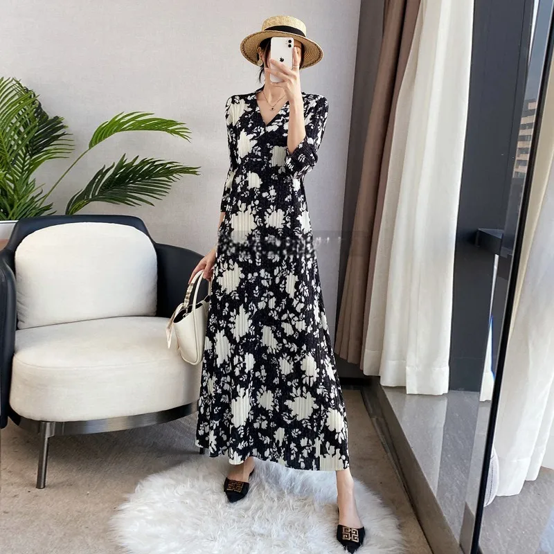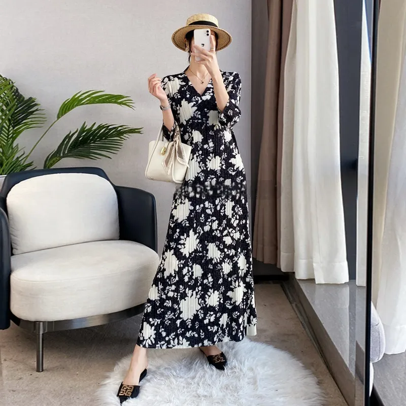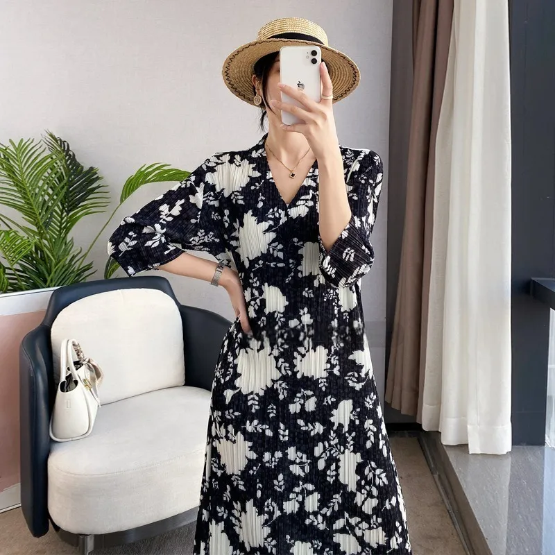 衣都精品- 2023新款收腰顯瘦V領七分袖褶皺連衣裙