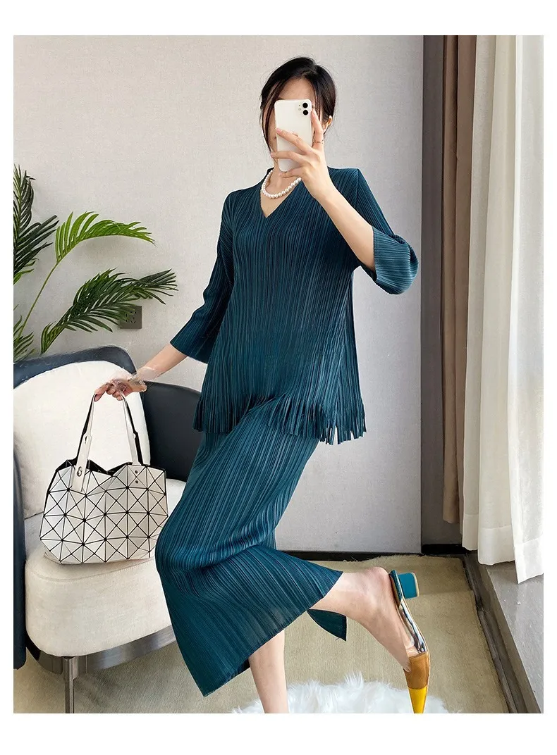 衣都精品- 2023新款高端時尚薄款流蘇上衣+半身裙褶皺套裝