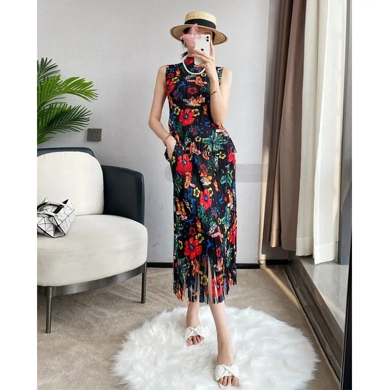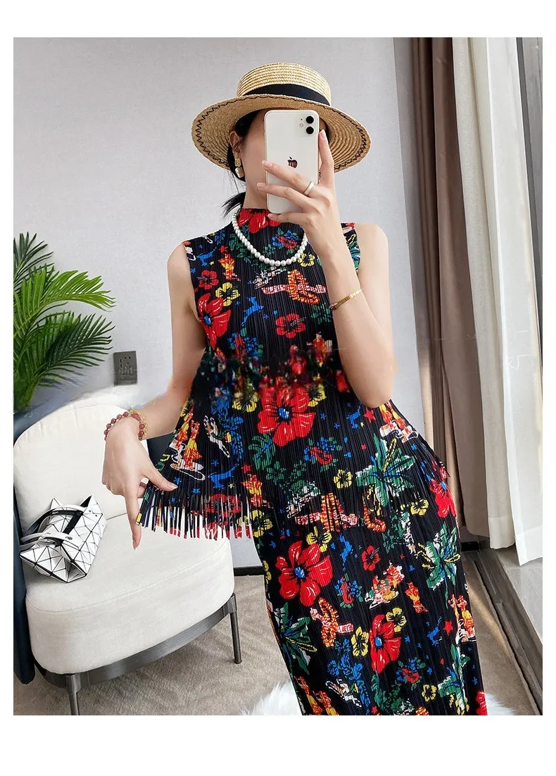 衣都精品- 2023新款圓領無袖背心印花開叉褶皺連衣裙