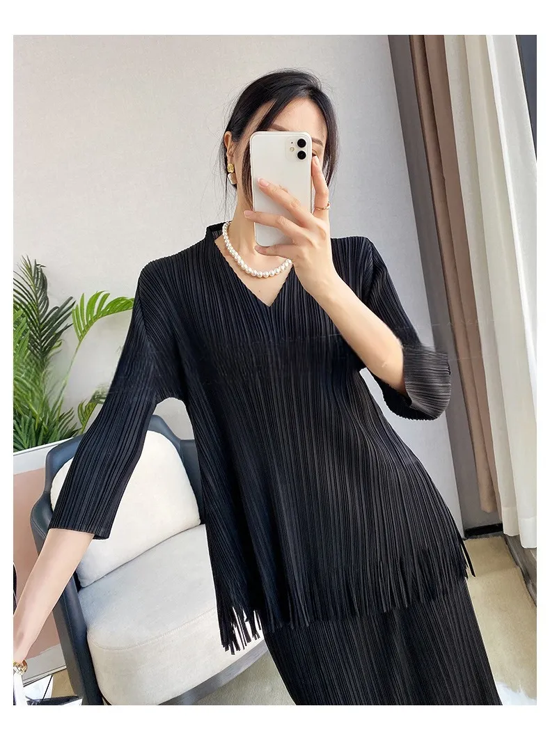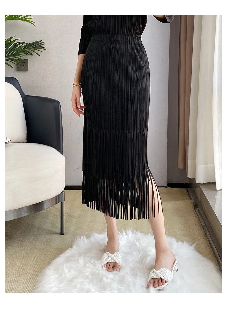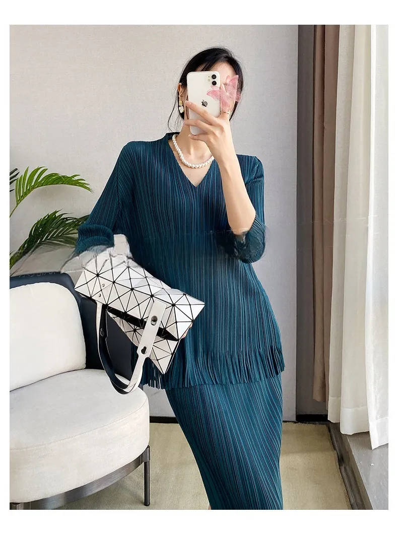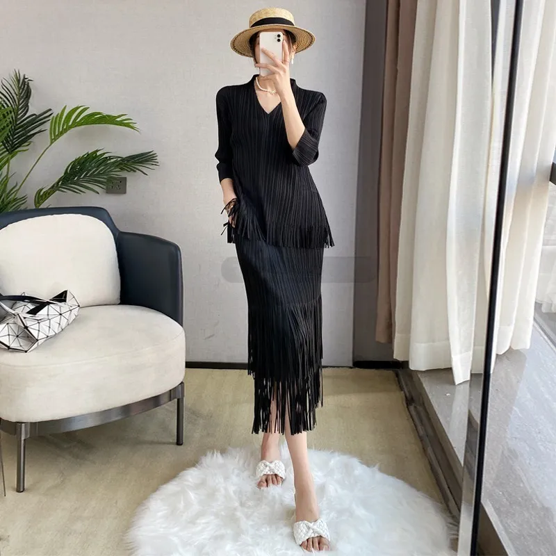 衣都精品- 2023新款高端時尚薄款流蘇上衣+半身裙褶皺套裝