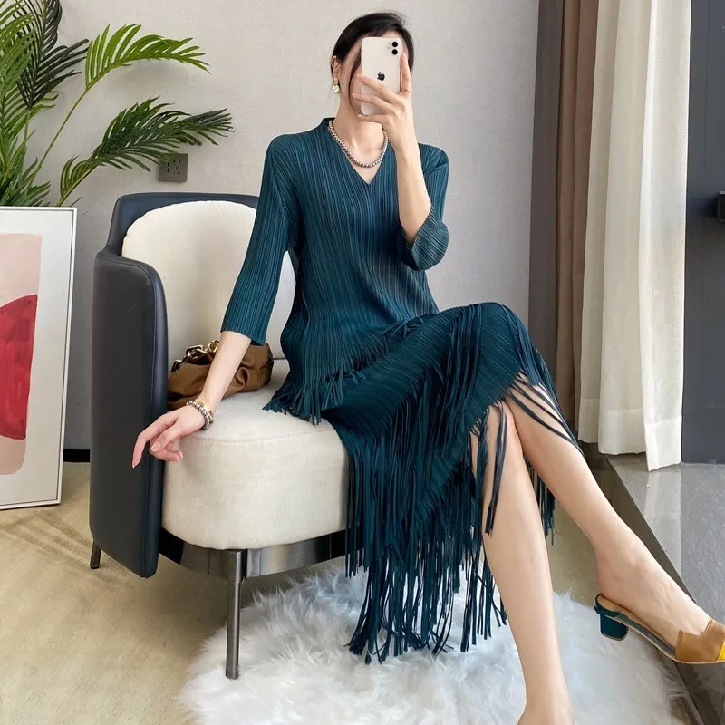 衣都精品- 2023新款复古流苏七分袖上衣+显瘦流苏半身裙褶皺套裝