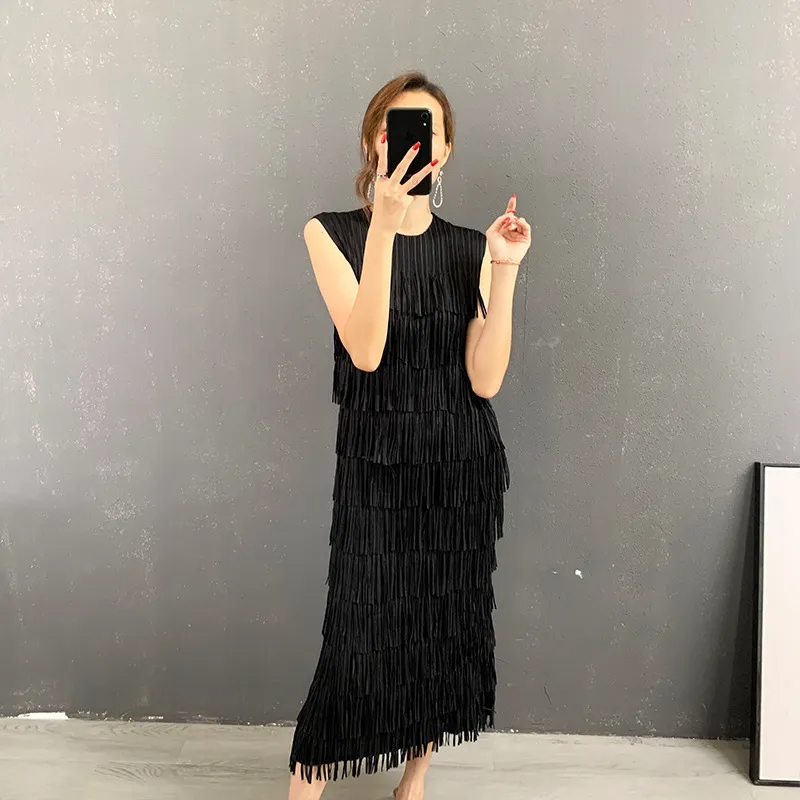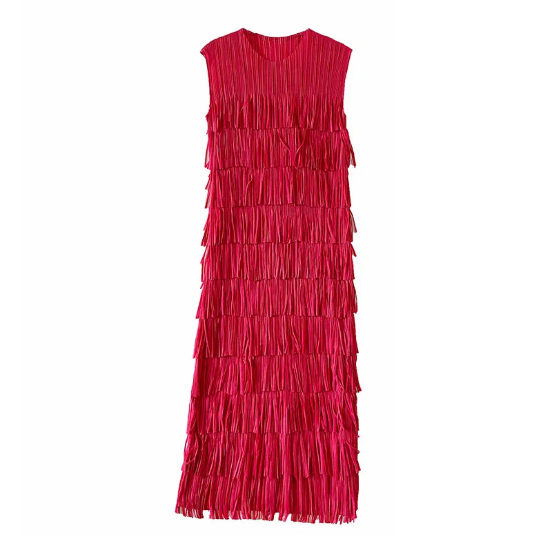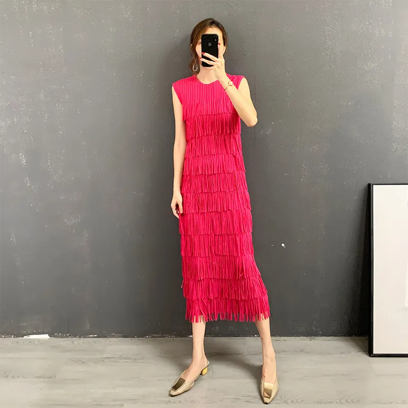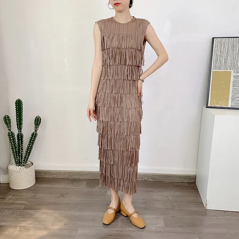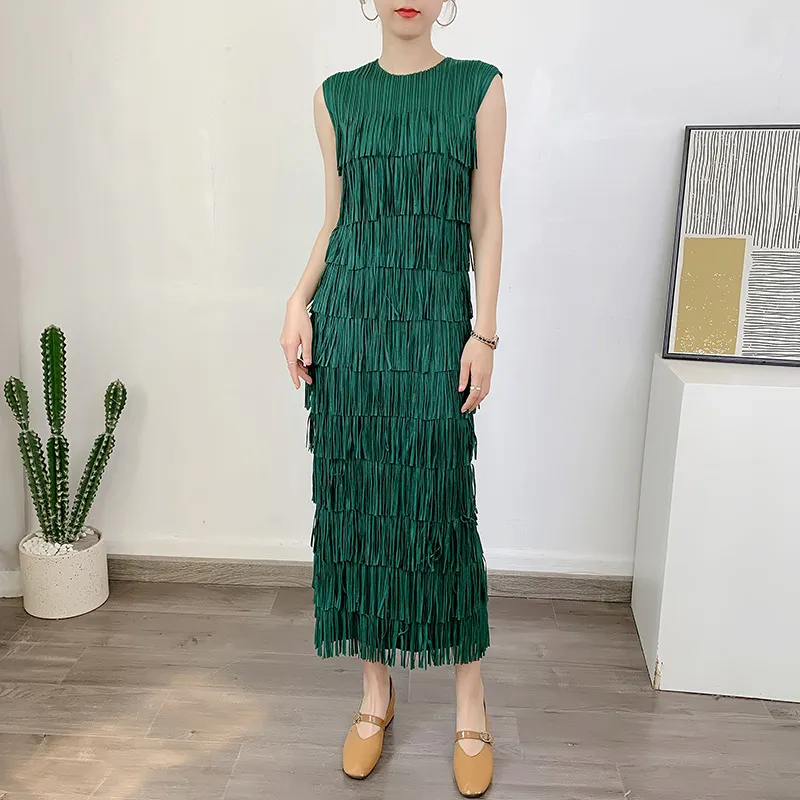 衣都精品- 2023新款圓領流蘇設計感百褶褶皺連衣裙