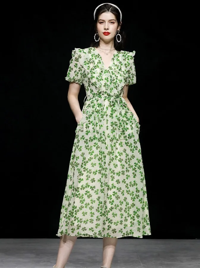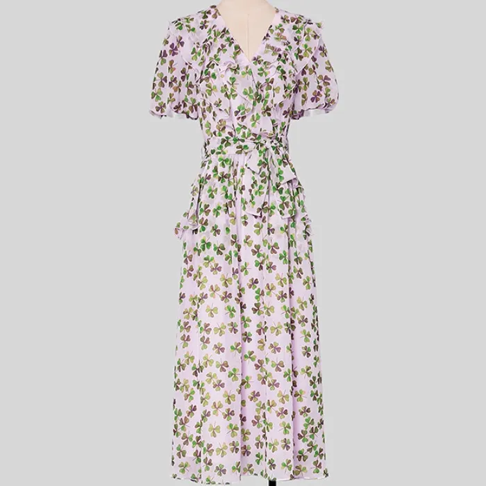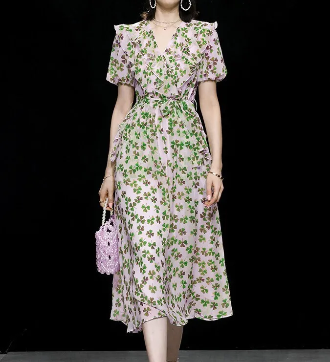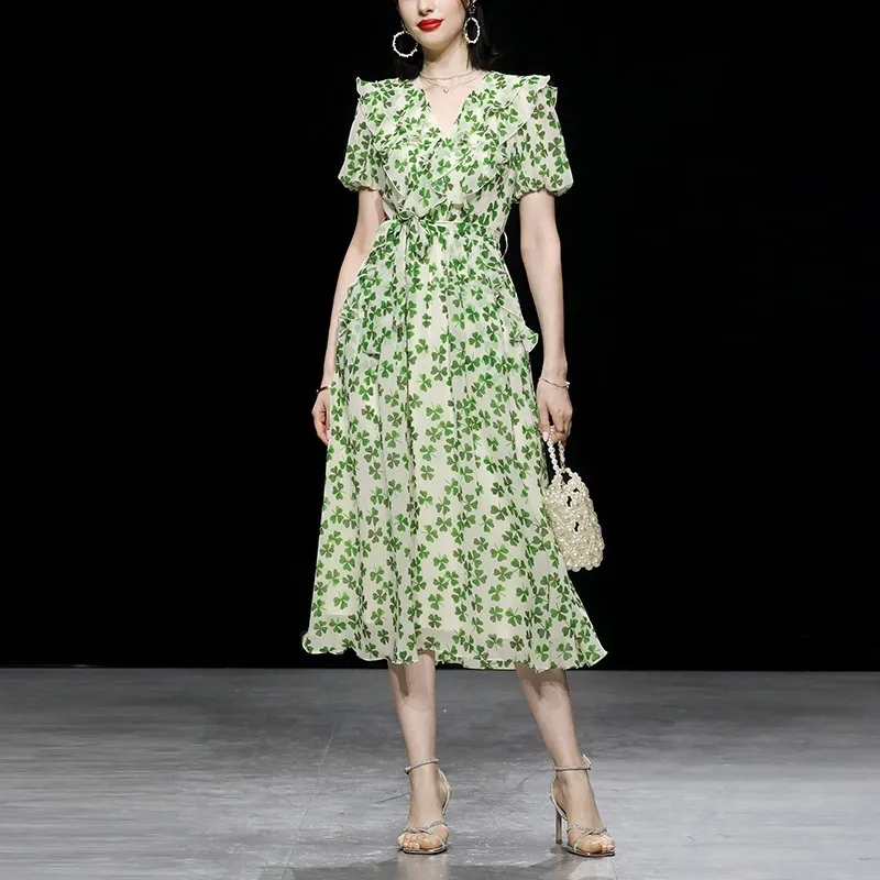 衣都精品- 2023新款泡泡袖收腰顯瘦印花連衣裙