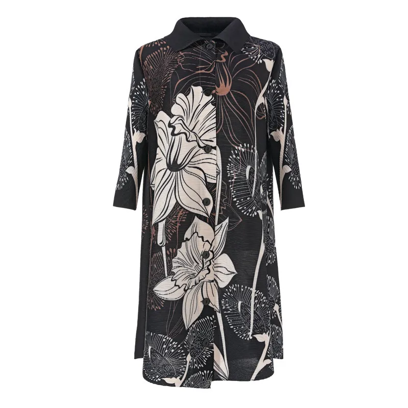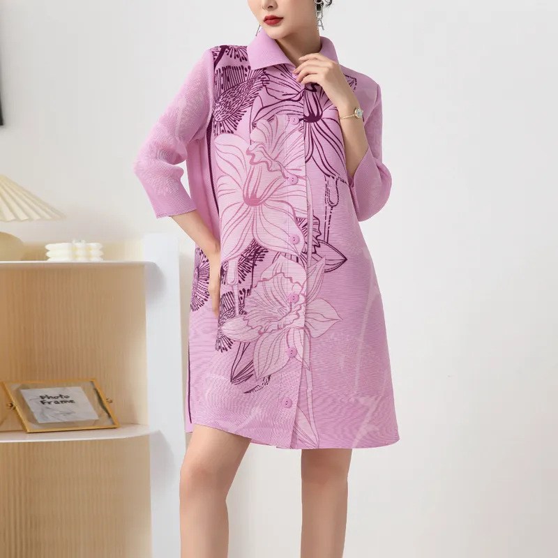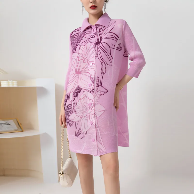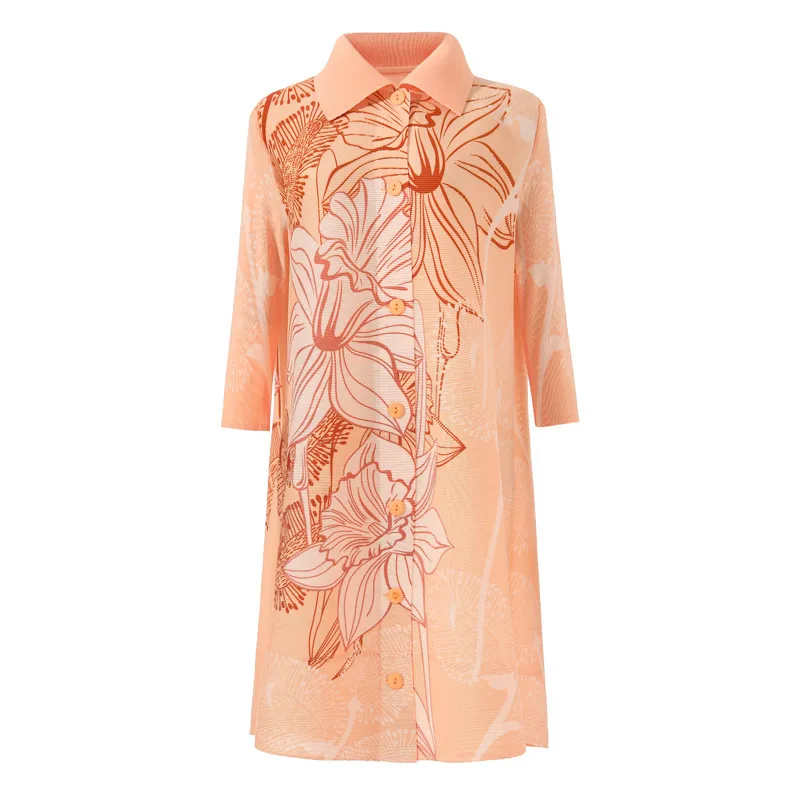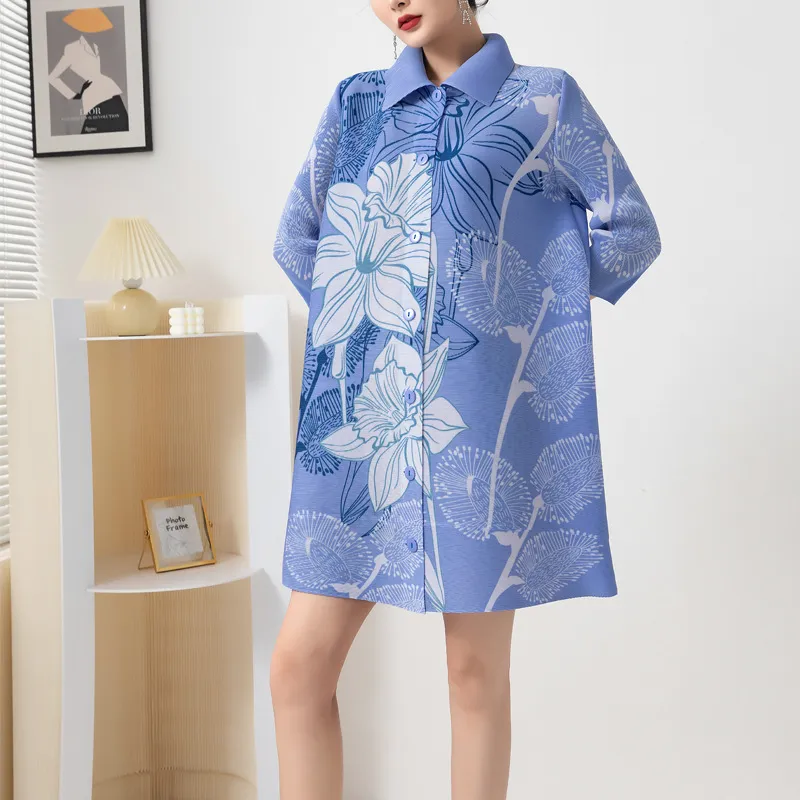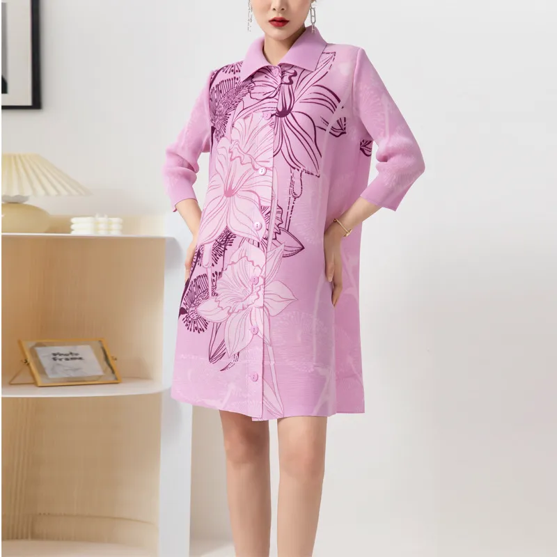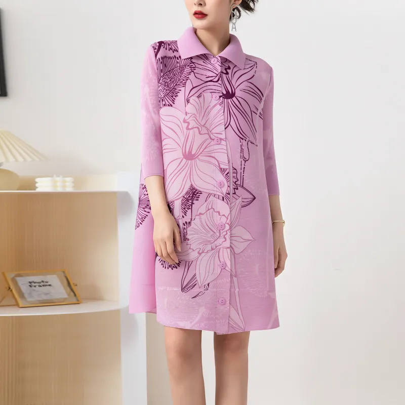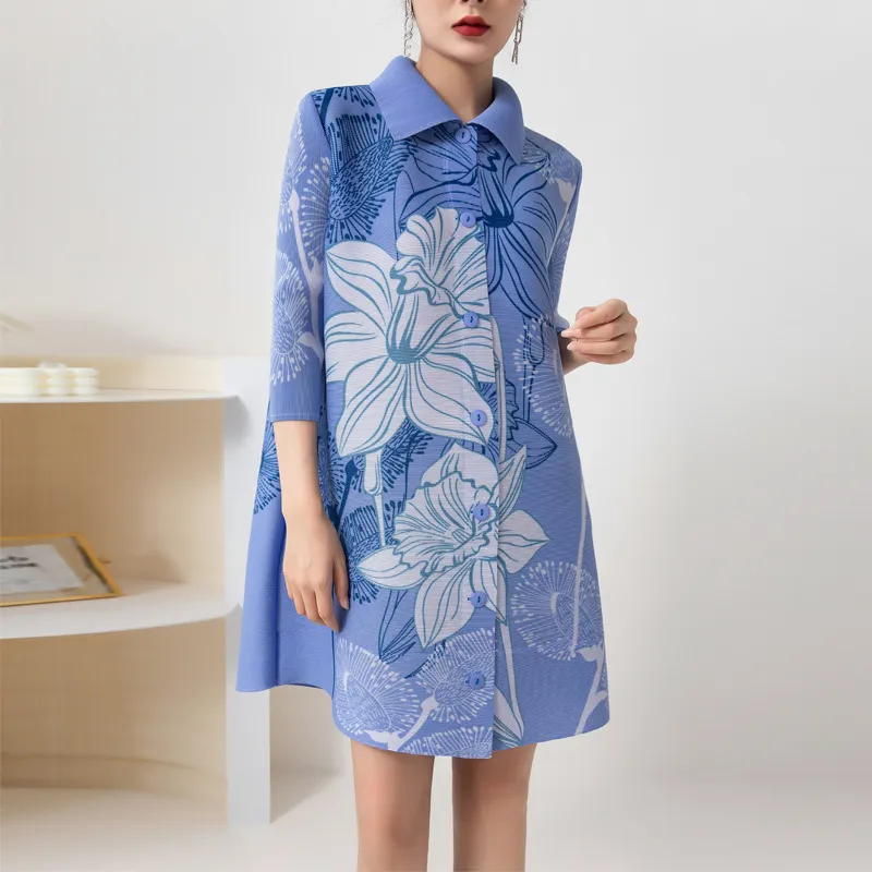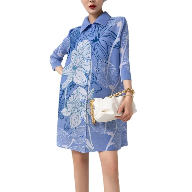 衣都精品- 2023新款方領單排扣褶皺印花大碼連衣裙