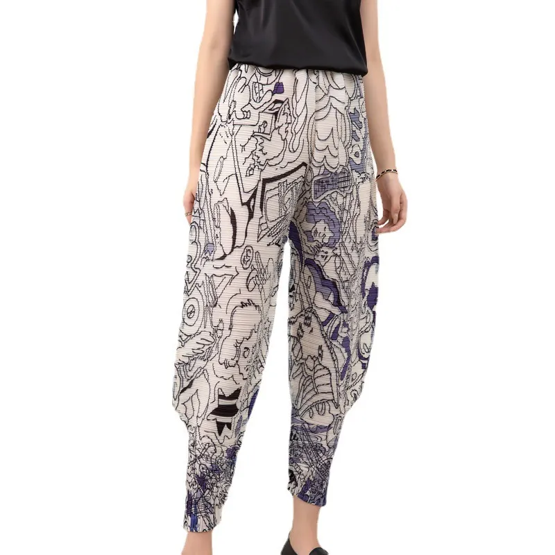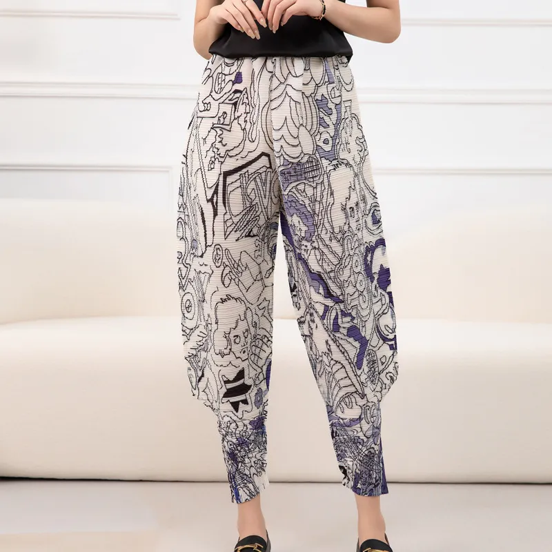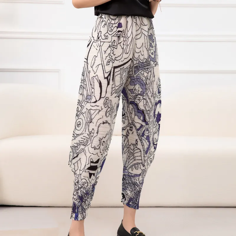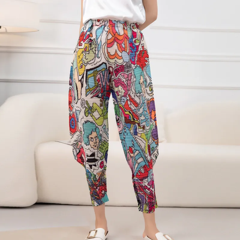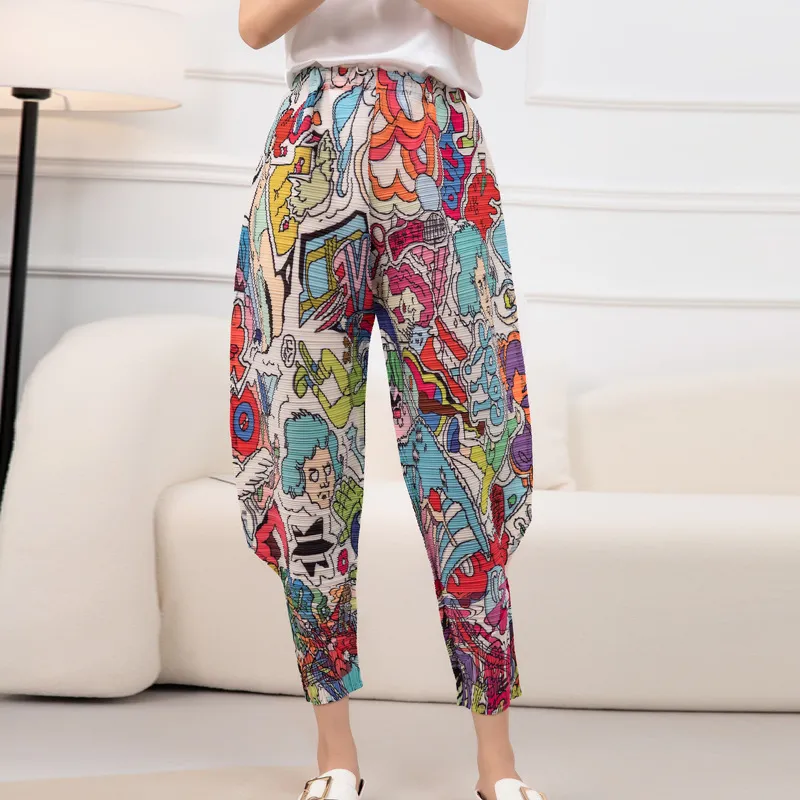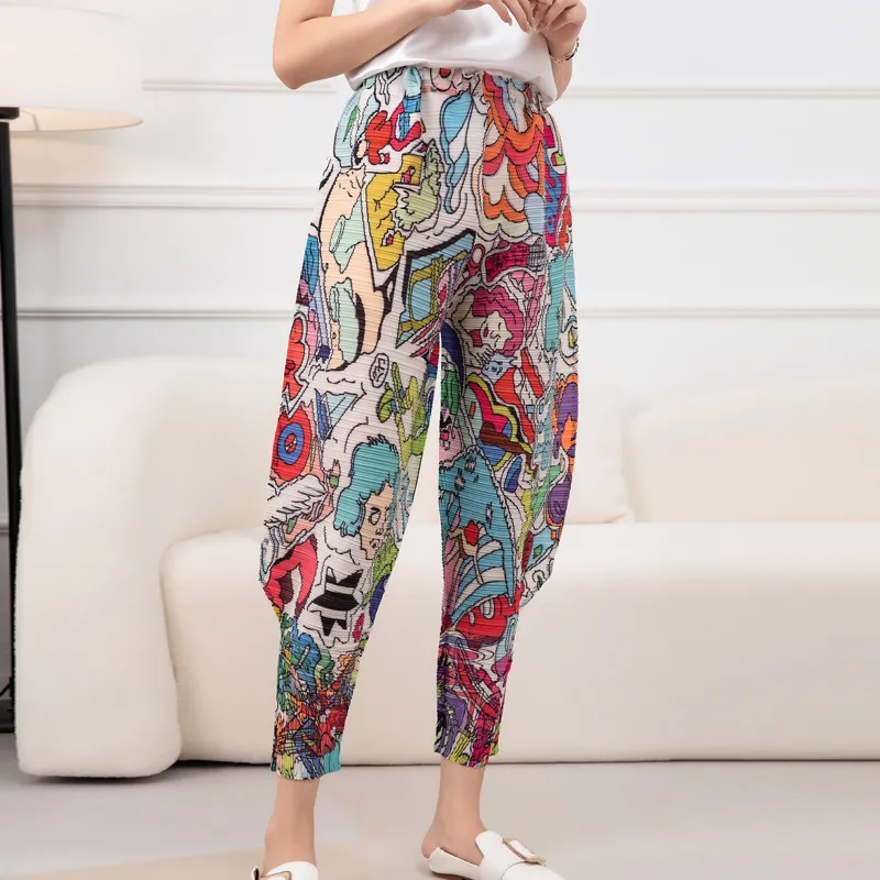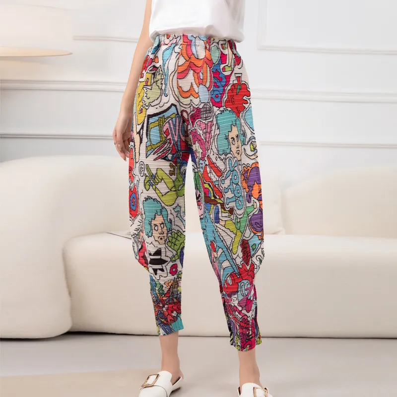 衣都精品- 2023新款休閒塗鴉印花風琴小腳高腰九分褲