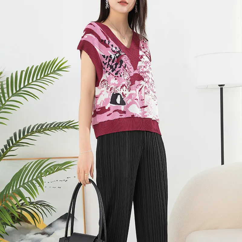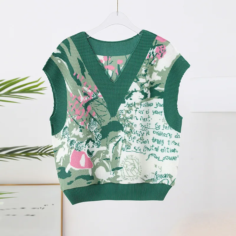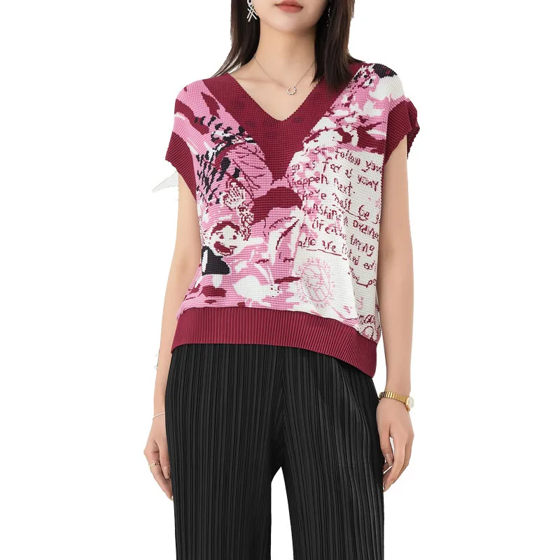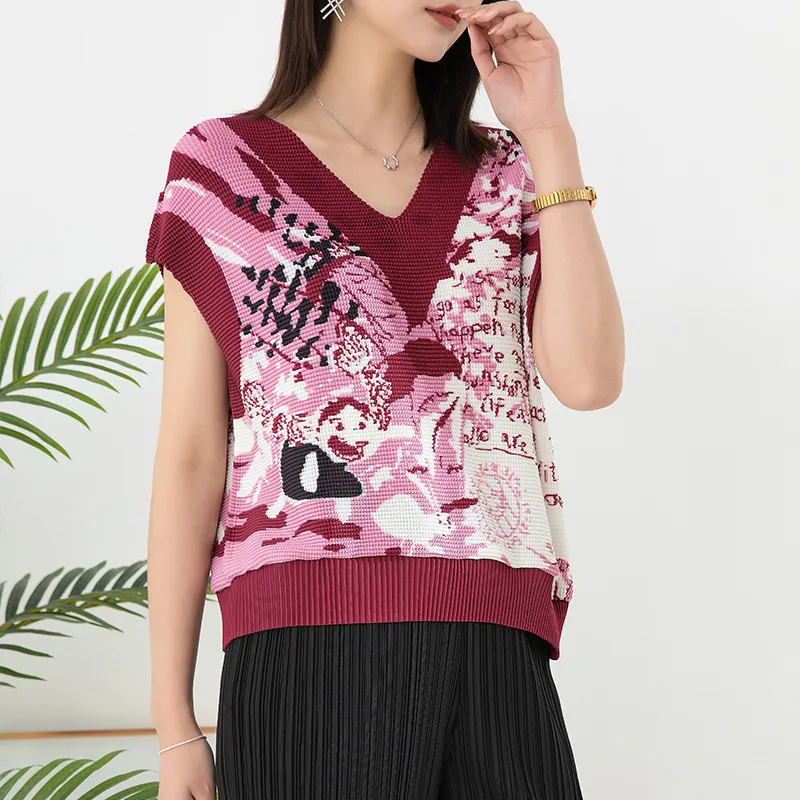 衣都精品- 2023新款褶皺印花拼接V領套頭百搭背心
