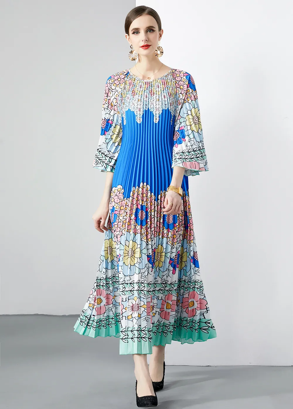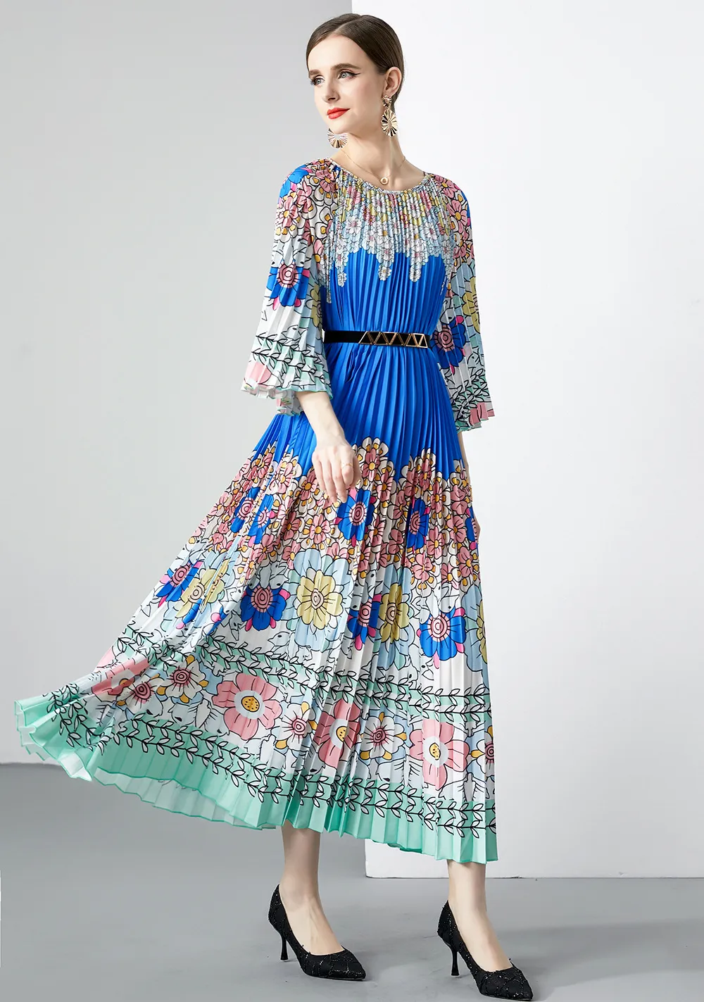衣都精品- 2023新款時尚復古印花百褶大擺連衣裙