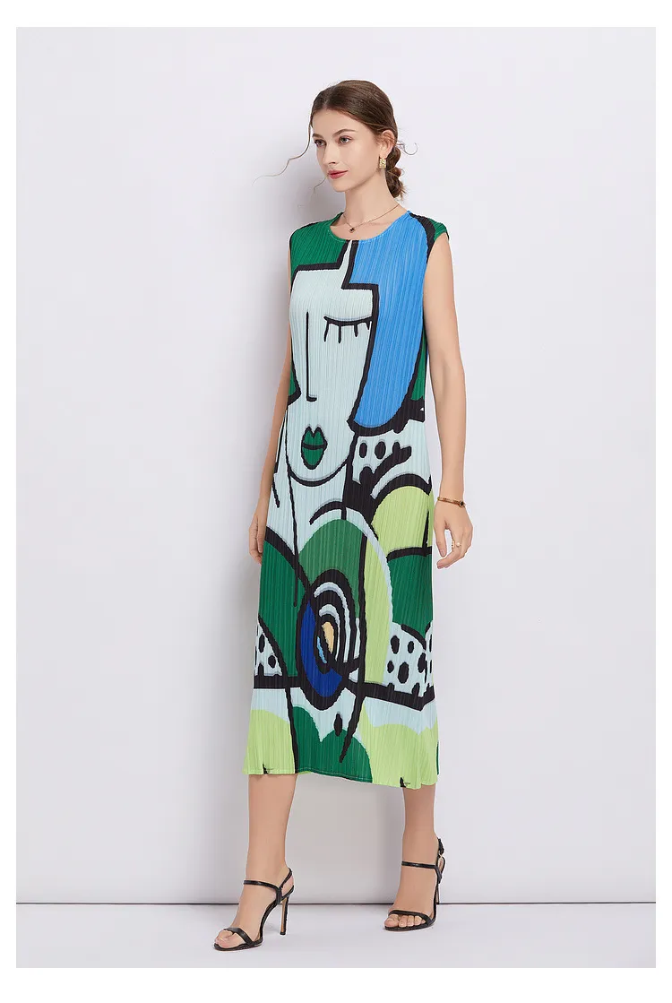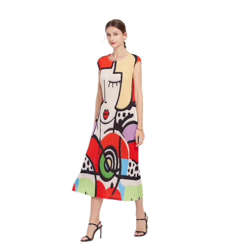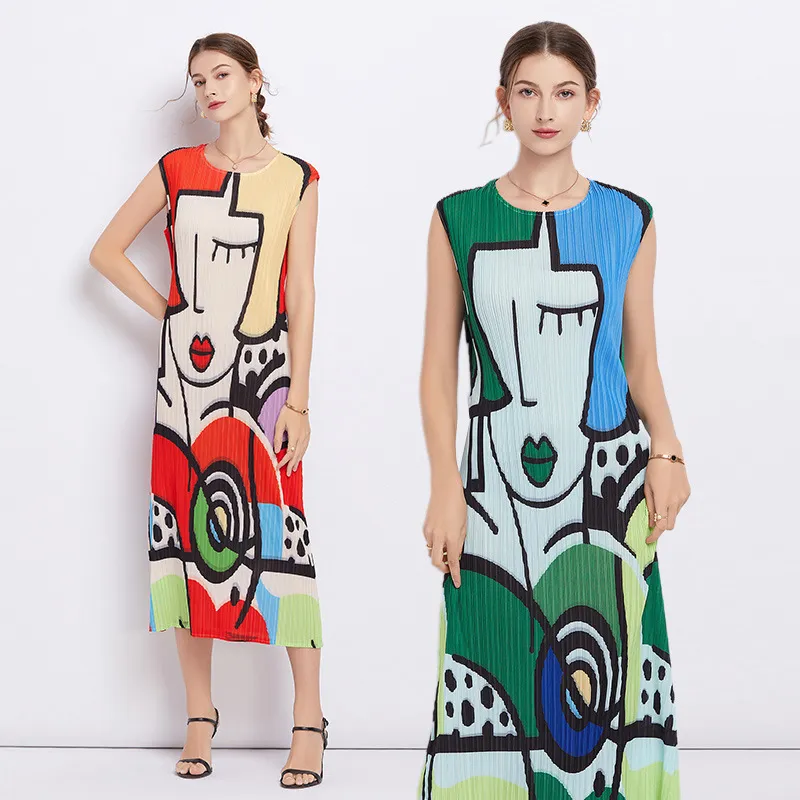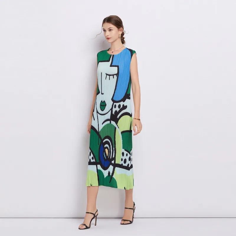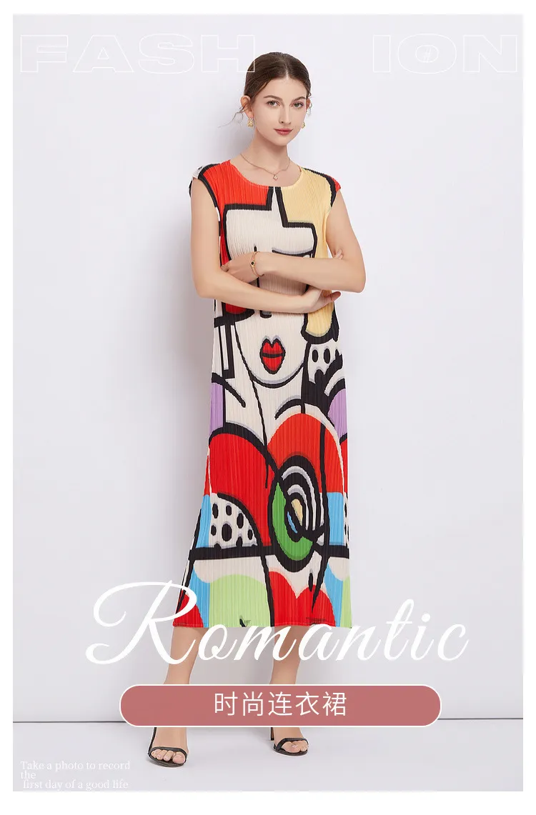 衣都精品- 2023新款復古印花顯瘦圓領無袖褶皺連衣裙