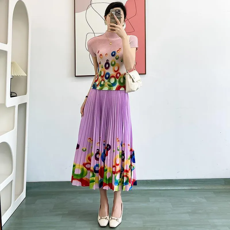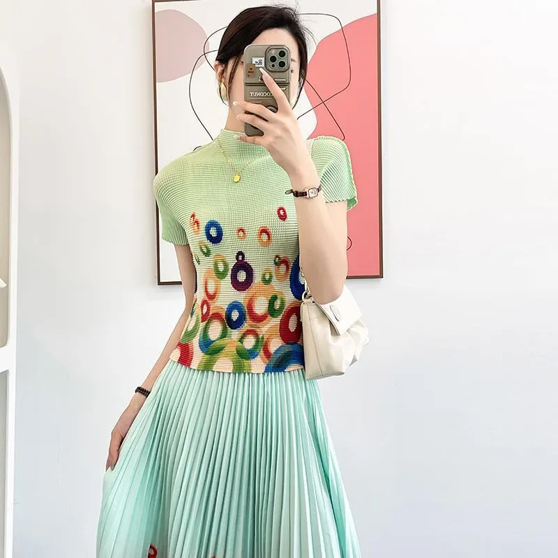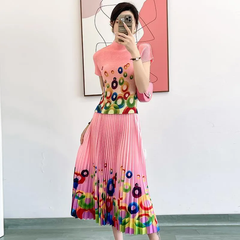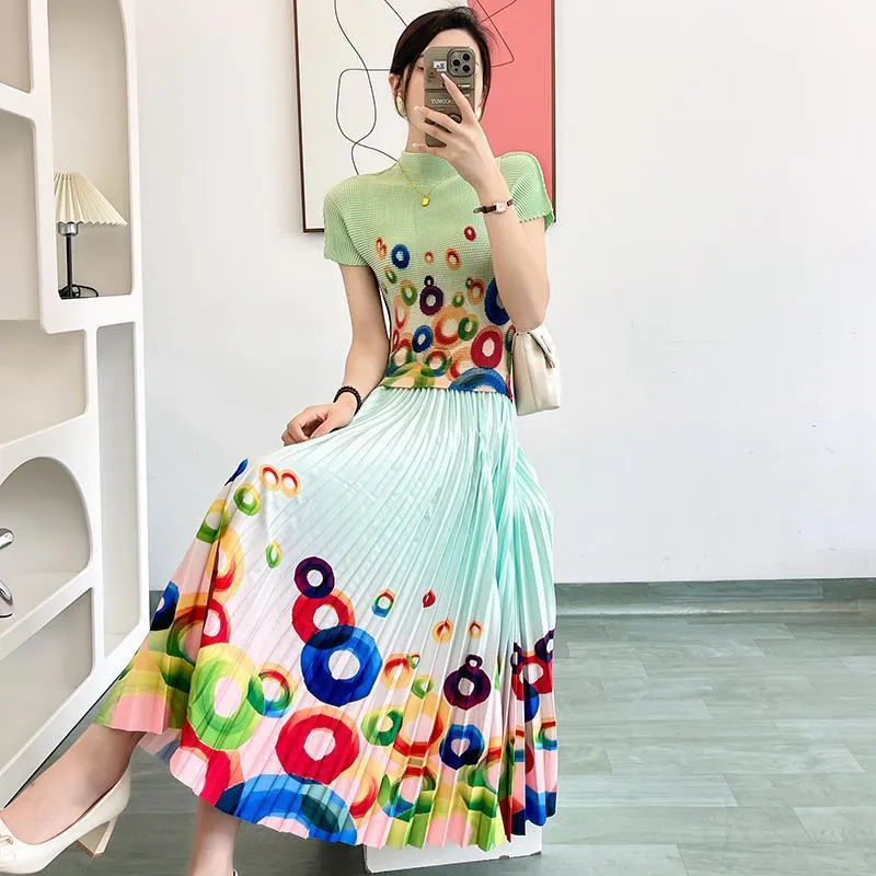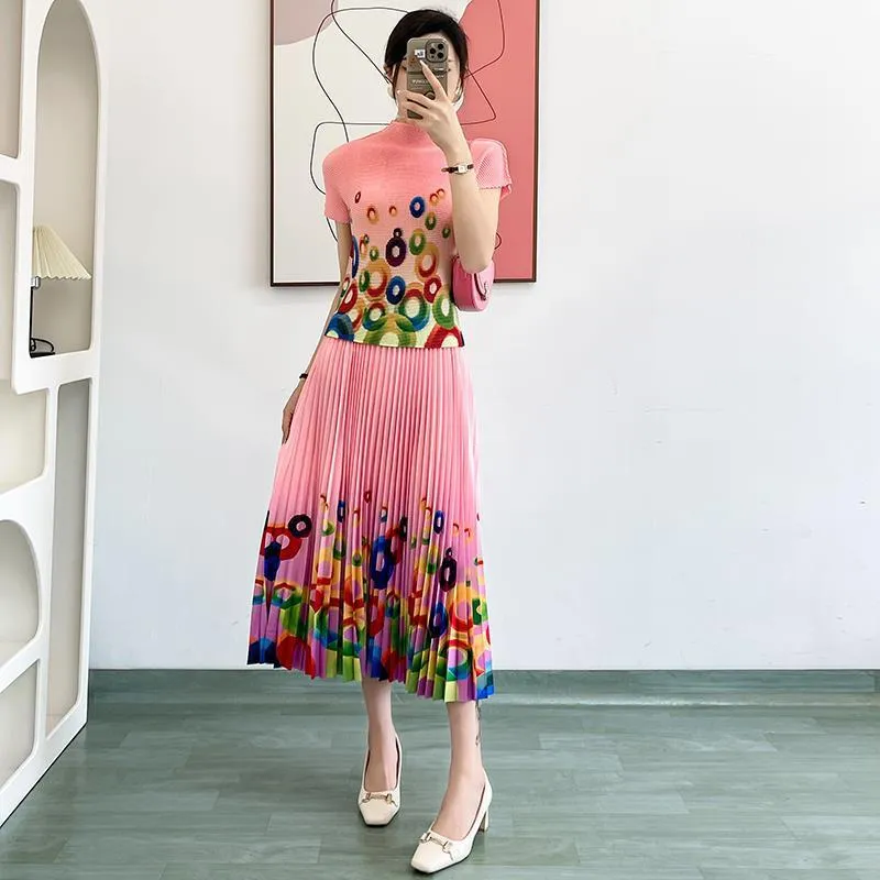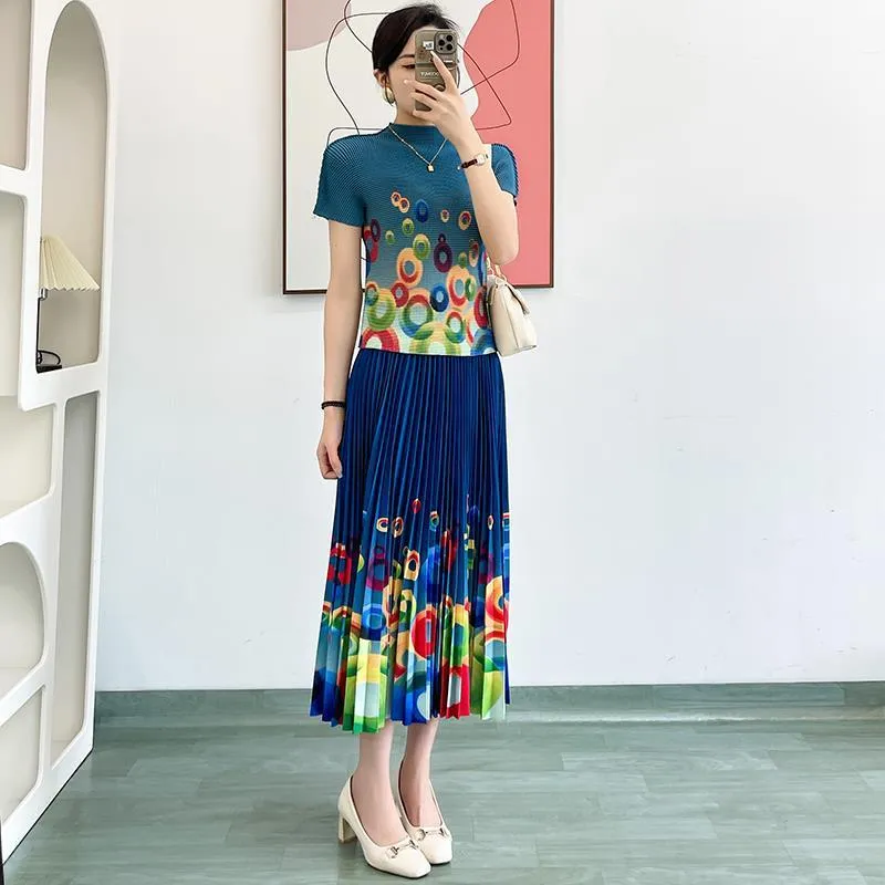衣都精品- 2023新款時尚修身小衫印花百褶上衣+半身裙二件套套裝