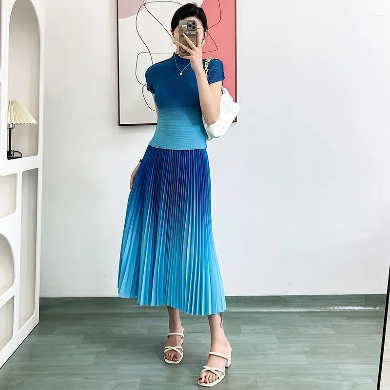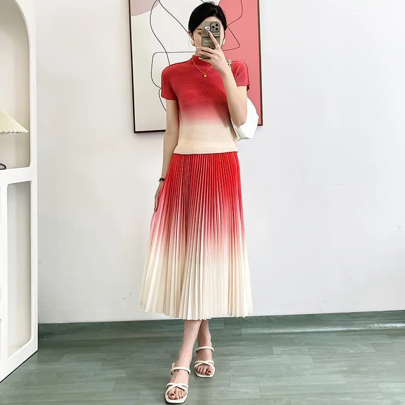 衣都精品- 2023新款時尚修身小衫印花百褶上衣+半身裙二件套套裝