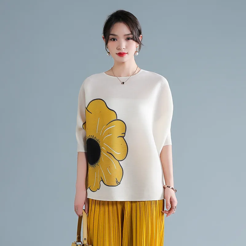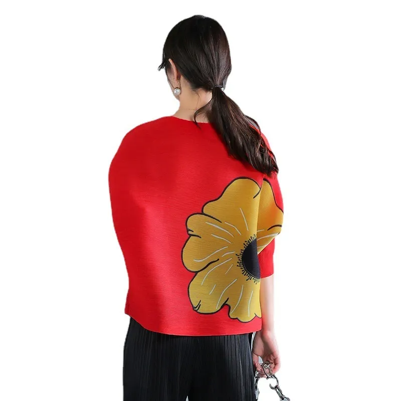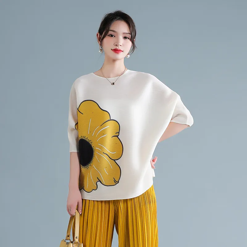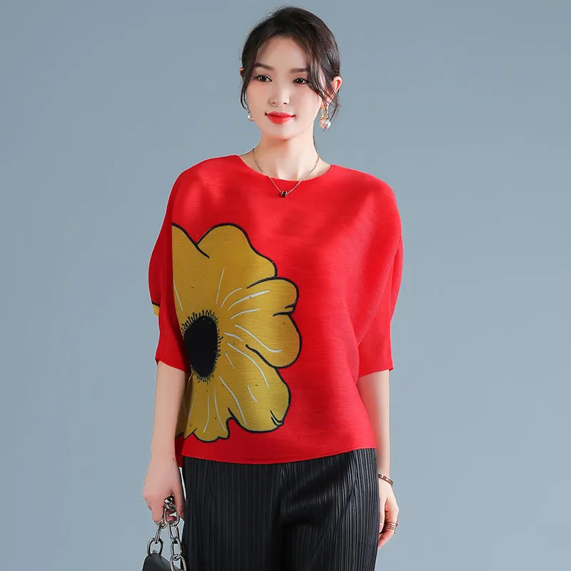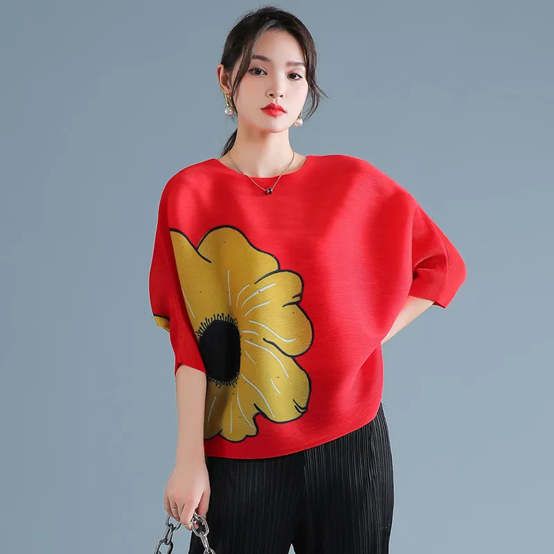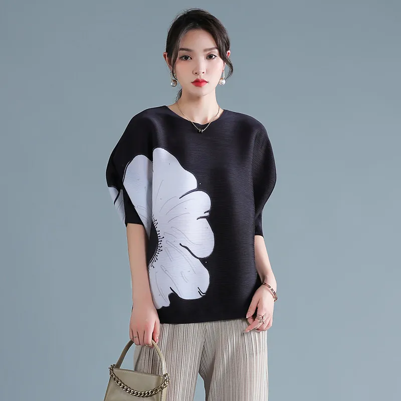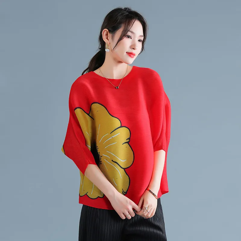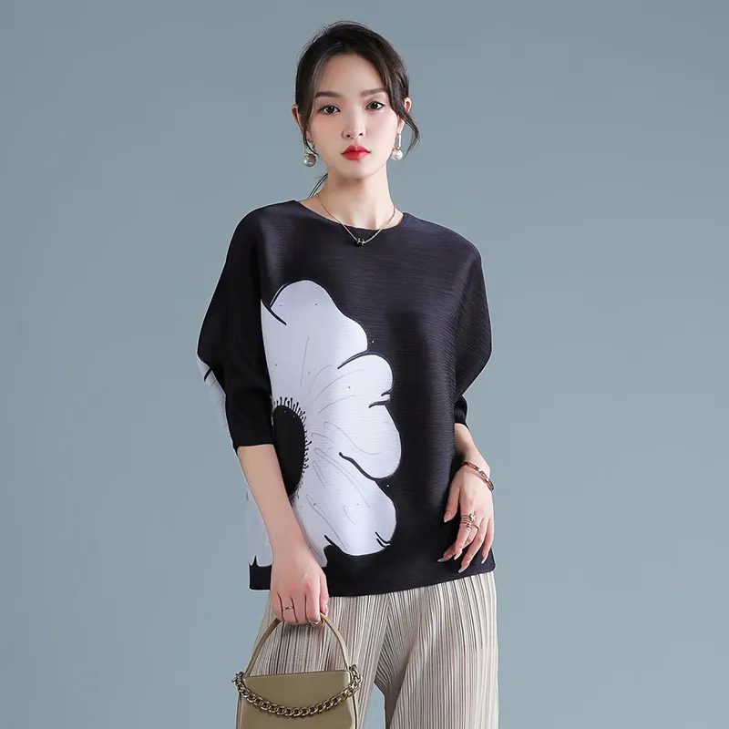 衣都精品- 2023新款時尚寬鬆蝙蝠袖印花褶皺上衣